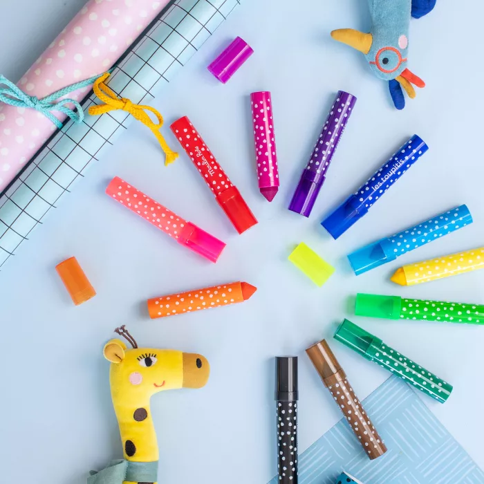 12 gros feutres de couleur avec une pointe conique pour un trait parfait quelle que soit l’inclinaison et qui ne s’enfonce pas ! Lavables à l’eau, ils seront vite adoptés par les tout-petits pour développer leur créativité et leur imaginaire.