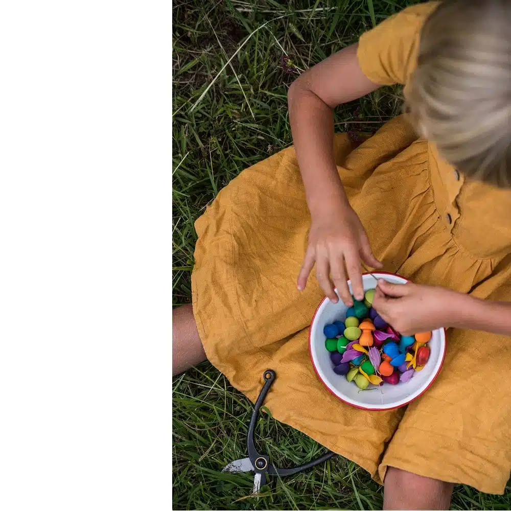 Ces 36 champignons en bois aux couleurs de l’arc-en-ciel de Grapat font partie de la collection Mandala. Cette collection de Grapat se décompose en plusieurs éléments naturels: fleurs, ananas, ruches, arbres, gouttes de pluie, etc. Les mandalas de Grapat sont tellement versatiles! Ils sont vraiment un bel ajout à votre matériel libre et polyvalent puisque les »loose parts » comme les mandalas de Grapat peuvent permettre l’émergence de certains concepts mathématiques en étant utilisés pour trier ou en faisant des séquences puis se transformer en jeu symbolique en devenant de la nourriture une fois dans un bol. Nos petits aiment faire des collections de toutes sortes d’objets! Avec ces petites pièces, leur envie de collectionner pourra atteindre un autre niveau.