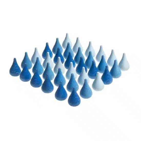 Ces 36 gouttes de pluie en bois bleu de Grapat font partie de la collection Mandala. Cette collection de Grapat se décompose en plusieurs éléments naturels: fleurs, ananas, ruches, arbres, gouttes de pluie, etc. Les mandalas de Grapat sont tellement versatiles! Ils sont vraiment un bel ajout à votre matériel libre et polyvalent puisque les »loose parts » comme les mandalas de Grapat peuvent permettre l’émergence de certains concepts mathématiques en étant utilisés pour trier ou en faisant des séquences puis se transformer en jeu symbolique en devenant de la nourriture une fois dans un bol. Nos petits aiment faire des collections de toutes sortes d’objets! Avec ces petites pièces, leur envie de collectionner pourra atteindre un autre niveau.