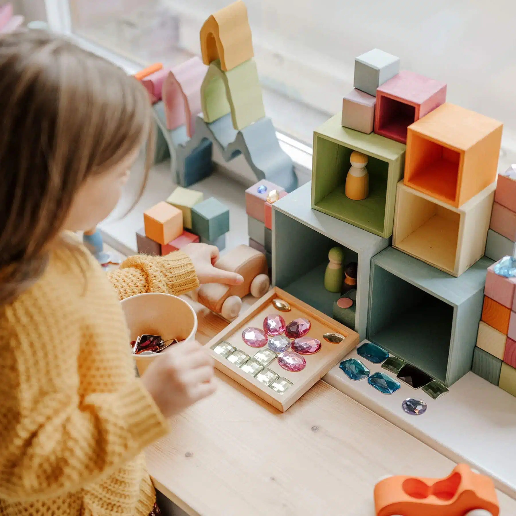 L’ensemble de 6 grandes boîtes empilables pastel est un jouet polyvalent pour les enfants : ils peuvent empiler, encastrer et trier les boîtes par taille ou par couleur, en plus de les utiliser pour construire, comme maison de poupée ou un abri de voiture, pour y collecter des trésors, etc. Ces boîtes peuvent aussi être utilisées pour les associer aux « loose parts » ou autre matériel libre de ces 6 couleurs. 6 pièces.