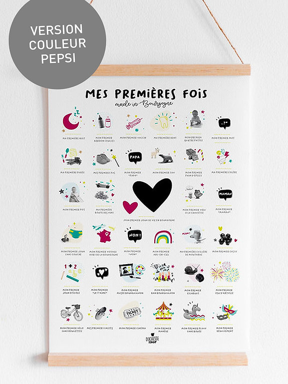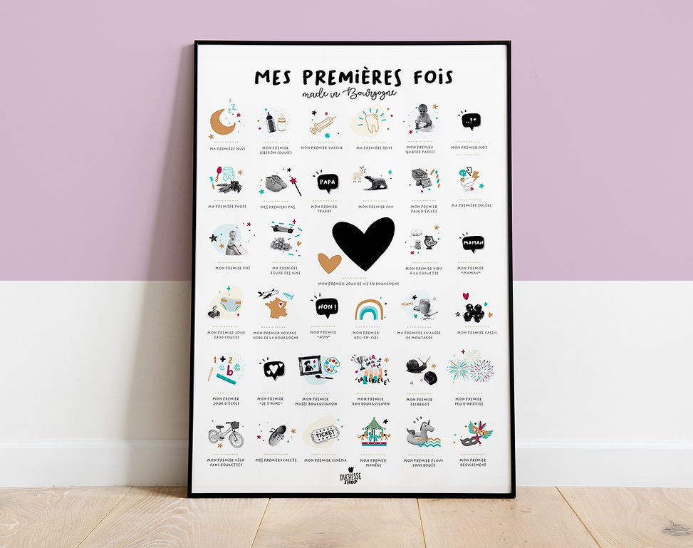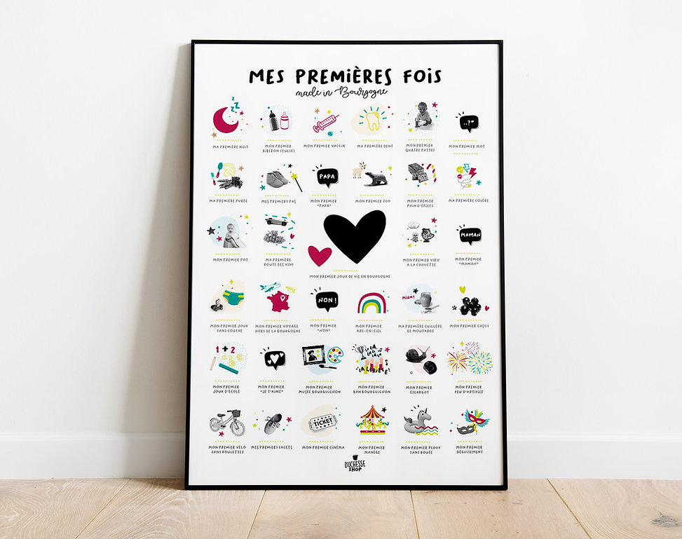40 souvenirs bourguignons à immortaliser ! Premier vœu à la Chouette, première cuillère de moutarde, premier tour sur la route des vins… Craquez pour cette belle affiche qui vous permettra de garder un souvenir de tous les grands moments de vie de vos petits Bourguignons ! Convient aussi bien aux chambres des garçons qu’à celles des filles. Le top pour un cadeau de naissance ! Caractéristiques de l’affiche : Format 30x40cm Liste de naissance : pour constituer votre propre liste d’articles avant de passer à la boutique de Dijon, ou bien pour préparer une liste de naissance que vous pouvez…