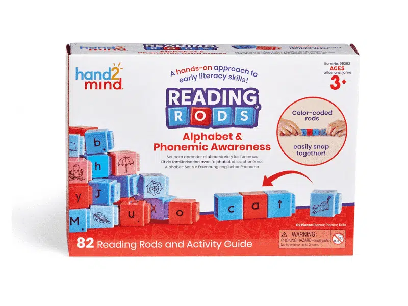 Alphabet et conscience phonémique – Reading Rods® de Hand2Mind est un outil pédagogique conçu pour aider les enfants à apprendre l’alphabet et développer la conscience phonémique de manière interactive et pratique.