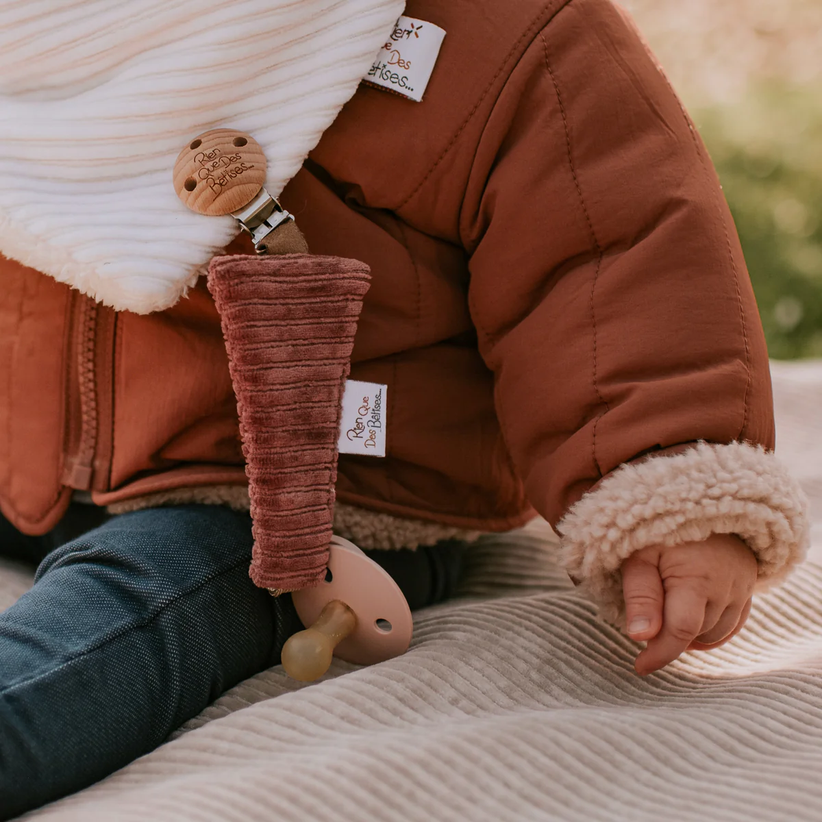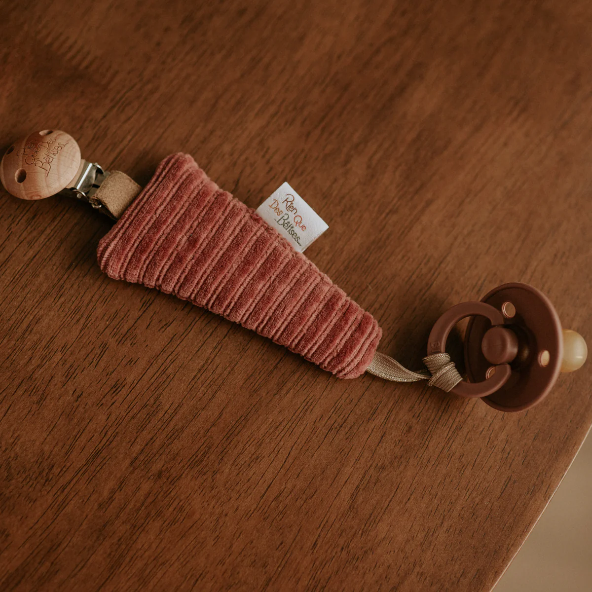 Confectionné entièrement à la main dans le nord de la France, cette Attache tétine velours framboise est pratique et élégante.