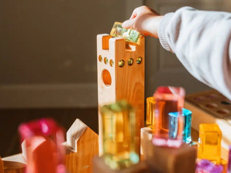 Cet ensemble de blocs transparents aux teintes colorées et pastel de Bauspiel contient 24 morceaux (12 couleurs, 2 blocs par couleur). À utiliser dans des bacs sensoriels, dans des univers féériques ou pour rehausser les constructions et faire des jeux de lumière (table lumineuse, lampe de poche, etc.).