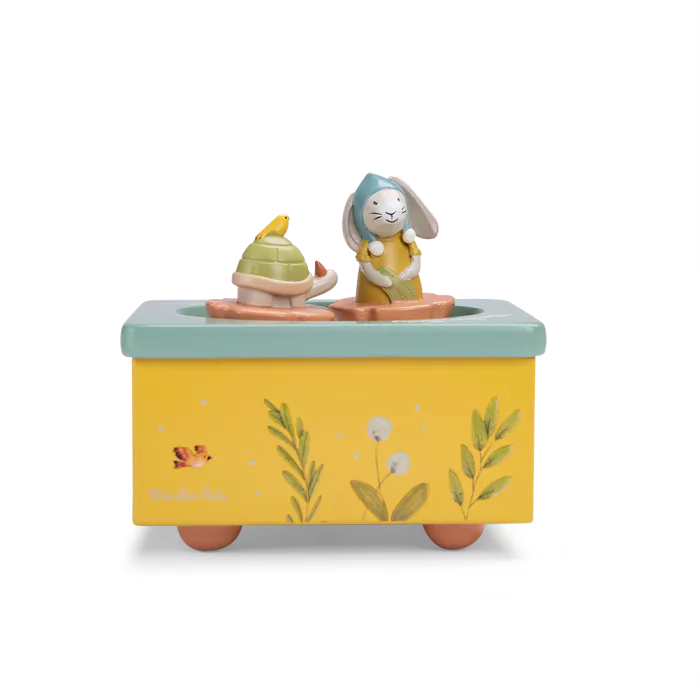 Boîte à musique aux couleurs de la gamme, illustrée d’un joyeux paysage composé de plantes, légumes et petits oiseaux du jardin. Le lapin et la tortue tournent et dansent sur la piste pour bercer et endormir bébé.