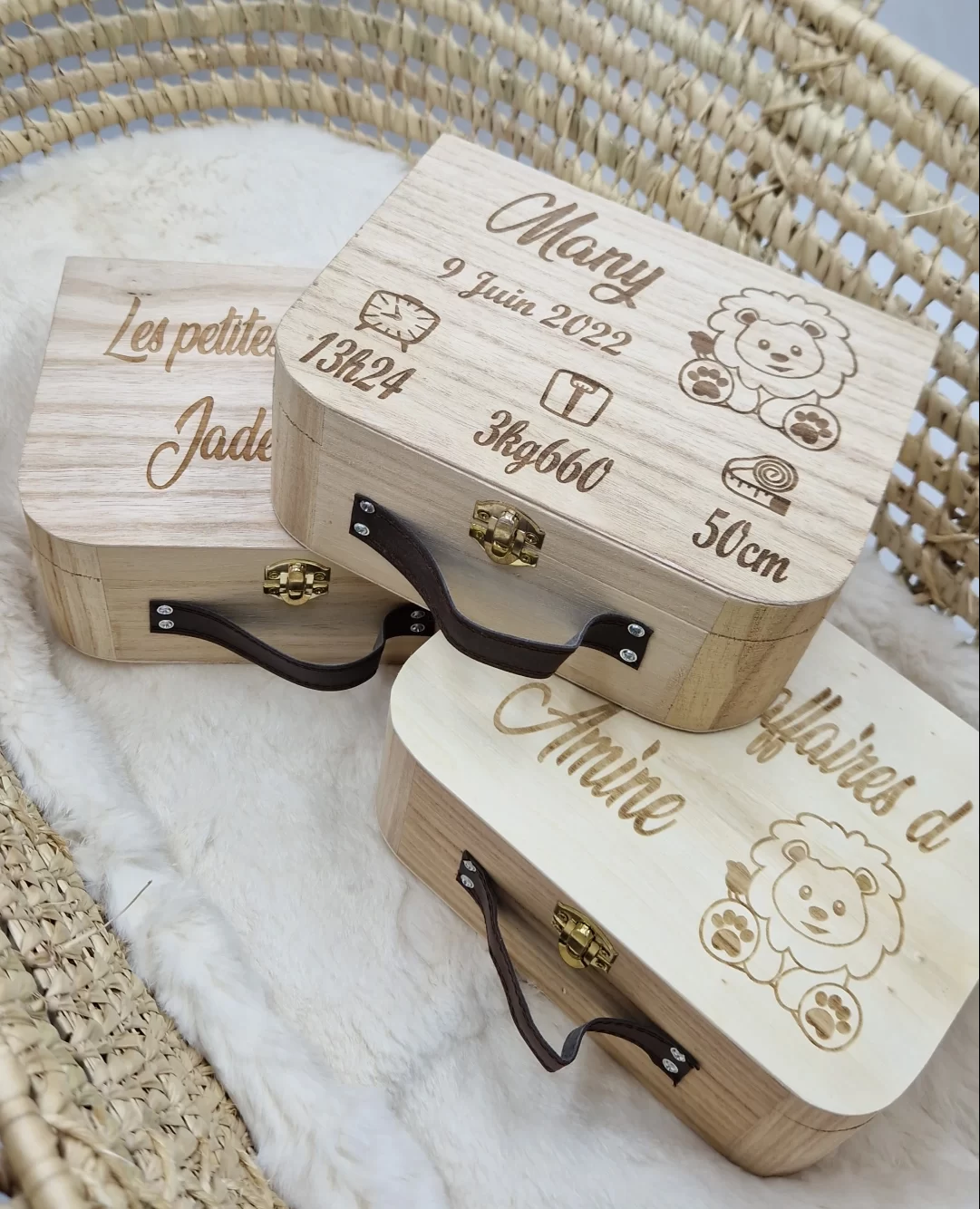 Quoi de mieux qu’une belle valisette en bois gravée pour garder les premiers souvenir de son petit trésor et à mettre en décoration dans la chambre.