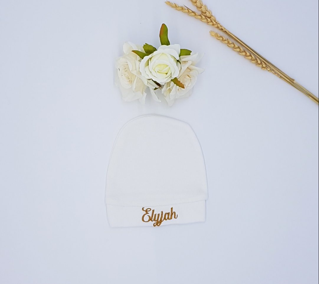 Bonnet de naissance personnalisé au prénom de votre bébé. Un seul prénom est brodé.