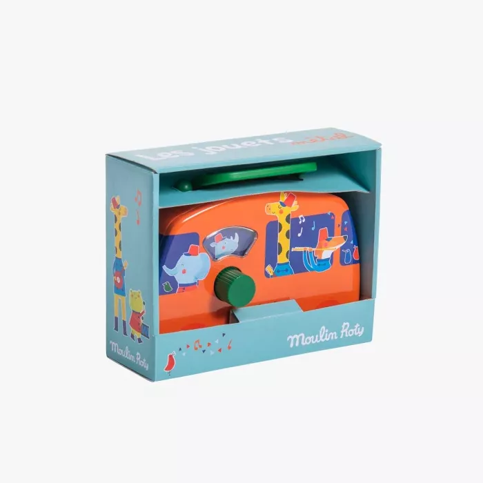 Bus radio en métal, au style estafette publicitaire, illustrée d’une fanfare d’animaux joyeux et colorés ! Il suffit de tourner le bouton pour les entendre jouer et les voir défiler derrière la fenêtre.