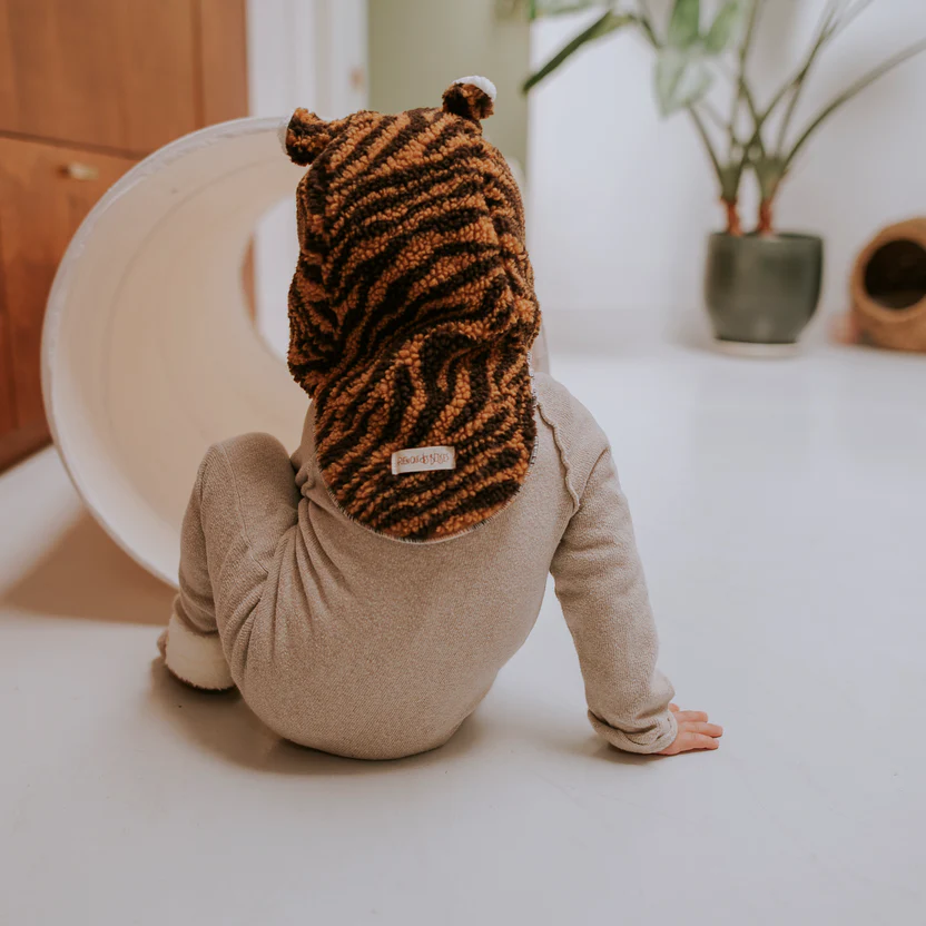 Donnez du mordant au dressing d’hiver de votre bébé avec notre cagoule en imprimé tigre camel et noir ! Doublée en teddy ultra moelleux, elle offre un parfait équilibre entre chaleur, confort et originalité. Idéale pour les petits explorateurs qui aiment se faire remarquer. 🐾