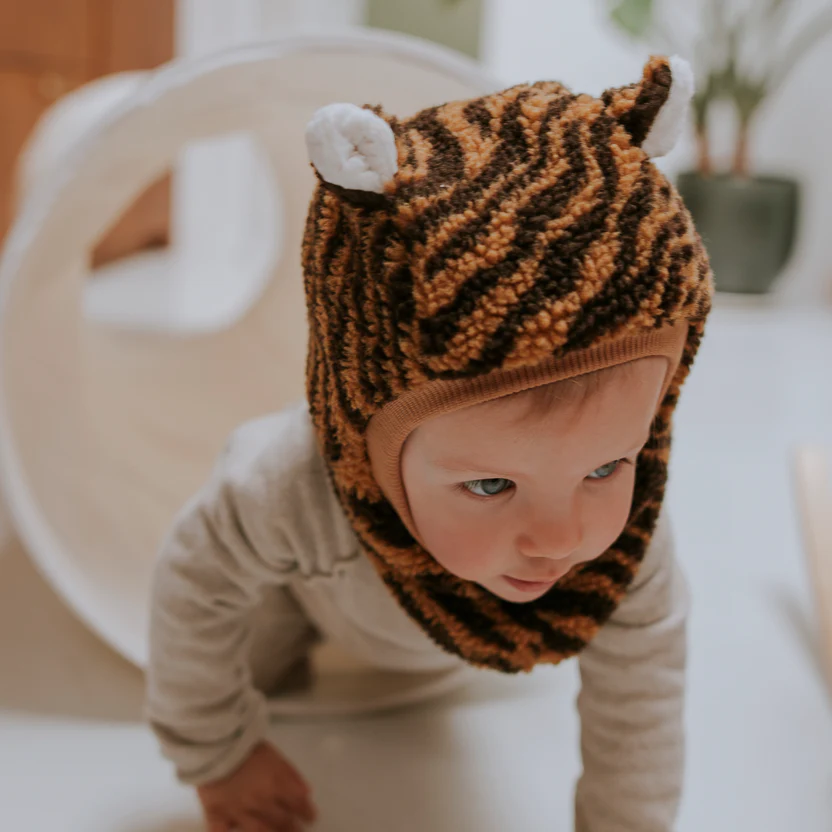 Avec son motif tigre camel & noir, cette cagoule transforme chaque sortie en mini safari. Un look audacieux et tendance, facile à matcher avec un manteau uni ou un look tout doux.