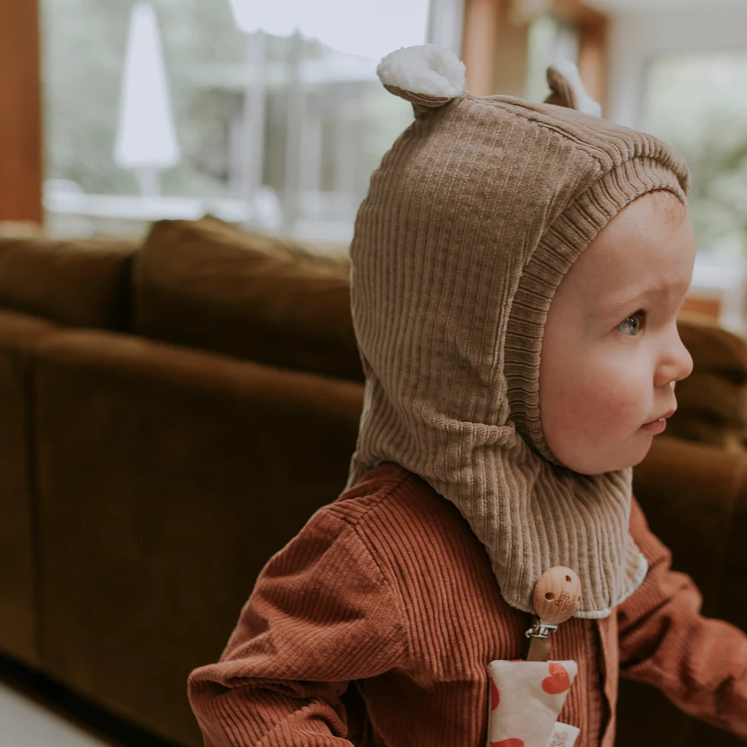 Enveloppez votre bébé dans une chaleur réconfortante avec notre cagoule en velours côtelé taupe, entièrement doublée en teddy moelleux. Sa teinte sobre est passe partout apporte une touche originale aux journées froides, tout en protégeant parfaitement les petites têtes.