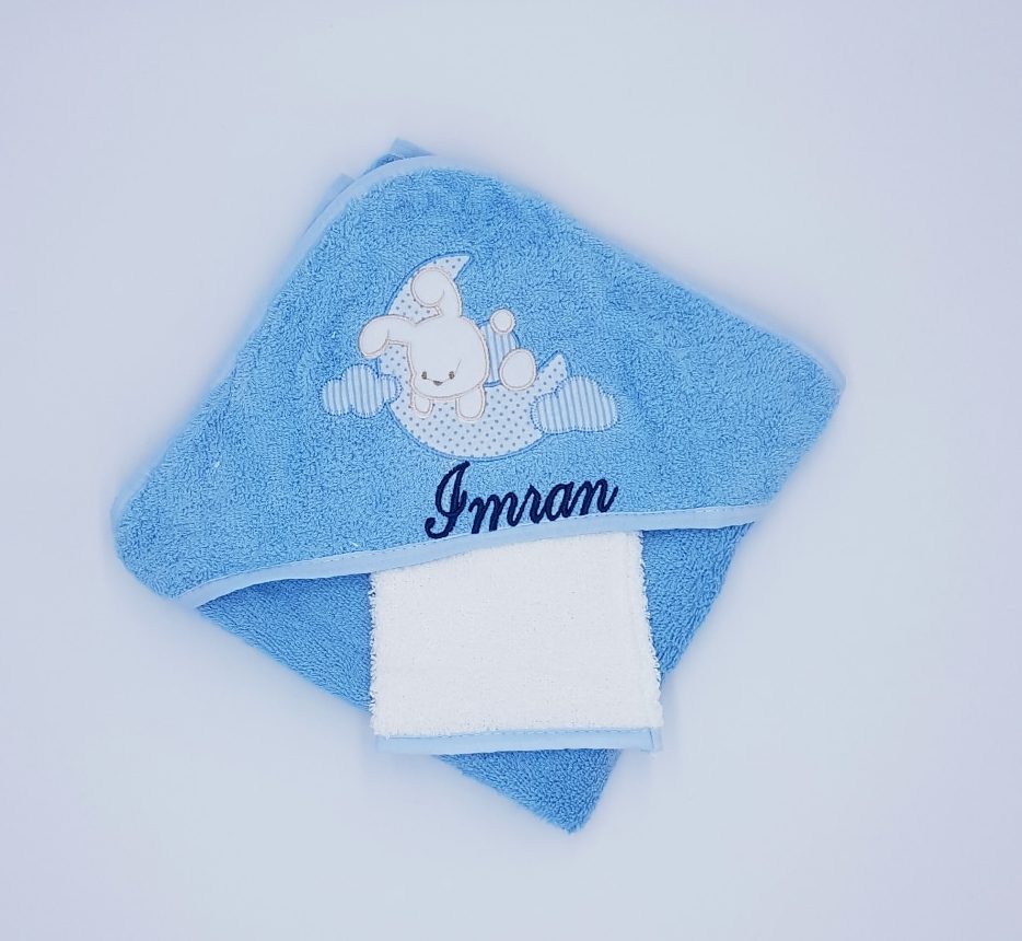 Cape de bain + gant de toilette 75*100 cm modèles selon disponibilité du stock. Prénom brodé en dessous du motif, merci d’indiquer par commentaire le motif souhaité, exemple: motif nuage, motif ourson…