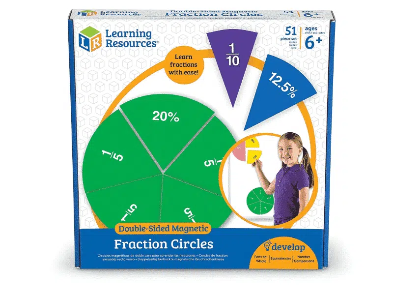 L’ensemble Cercle de fractions et pourcentages magnétiques, Fraction Circles®, de Learning Resources est un outil coloré pour enseigner les fractions de façon visuelle et interactive! Chaque segment magnétique est recto verso, avec les fractions d’un côté et les pourcentages de l’autre, offrant une approche claire et visuelle des relations entre ces deux concepts. Le format magnétique et recto verso facilite les démonstrations sur tableau blanc, en grand groupe ou en atelier.