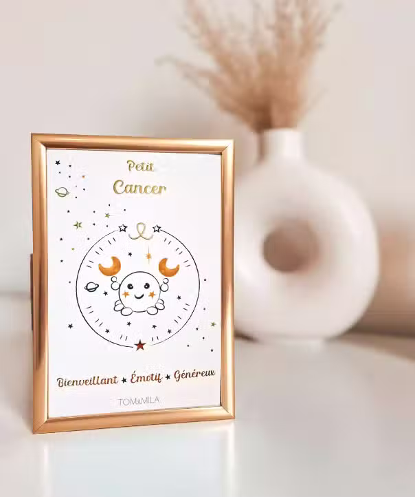 -Une carte de vœux format A6 laminage doré soulignant les traits de caractère du bébé selon son signe astrologique. La carte peut-être encadrée et servir de décoration dans la chambre de bébé.