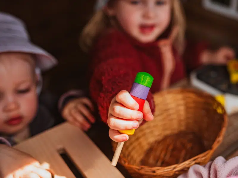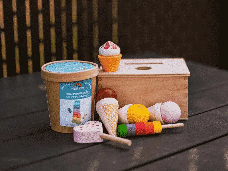 Utilisez le matériel de ce coffret pour inventer toutes sortes d’histoires ou pour mettre de l’avant les jeux de rôles. Utilisez les délices glacés pour partager. Servez-vous des boutons en bois pour payer vos achats et prenez plaisir à les insérer dans la fente de la boîte Montessori comme si c’était une petite caisse. Le trou du couvercle de la boîte Montessori est de la taille parfaite pour y faire tenir un cornet en attendant que le client paye sa facture. Les enfants pourront utiliser leur langage pour passer leur commande, questionner, comparer, décrire et compter pendant leur jeu. On est littéralement tombés en amour avec l’ajout de la boîte Montessori qui fonctionne à merveille dans ce coffret en la jumelant avec le reste du matériel. C’est aussi une belle façon d’utiliser une boîte simple et d’en faire des usages multiples et variés! Utilisez aussi ce matériel coloré pour trier et associer.