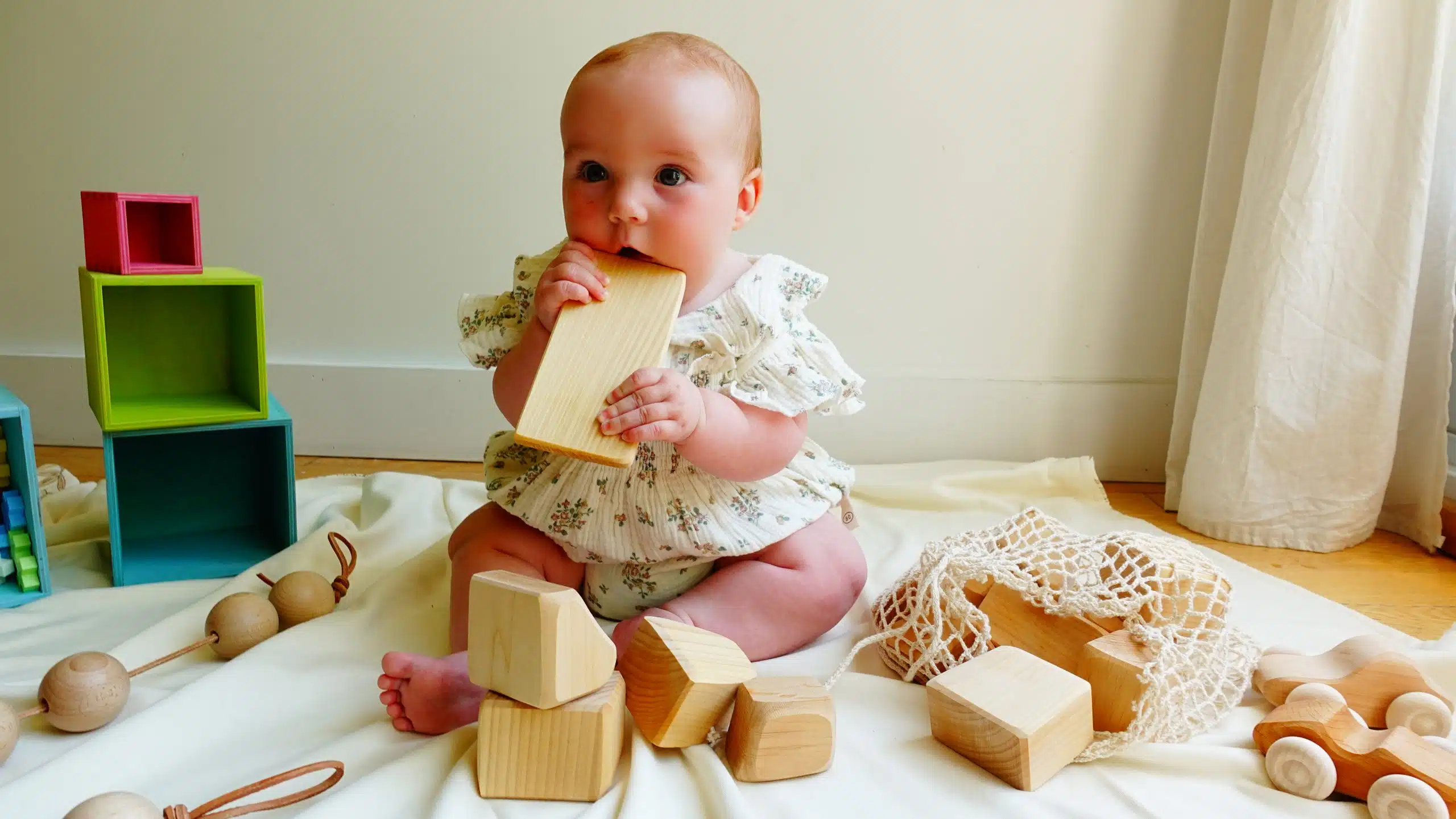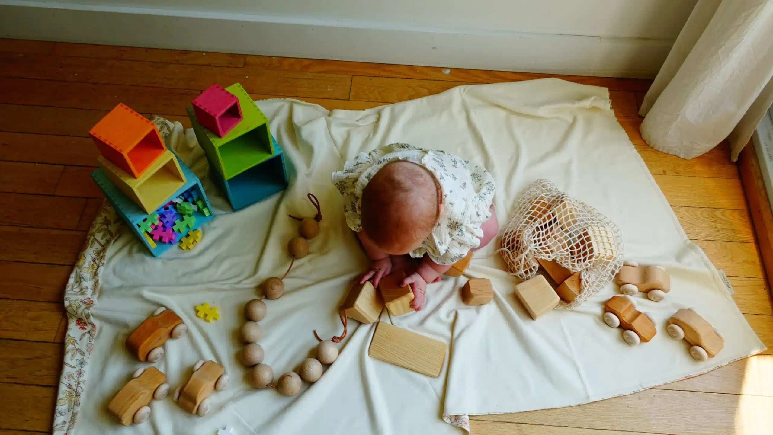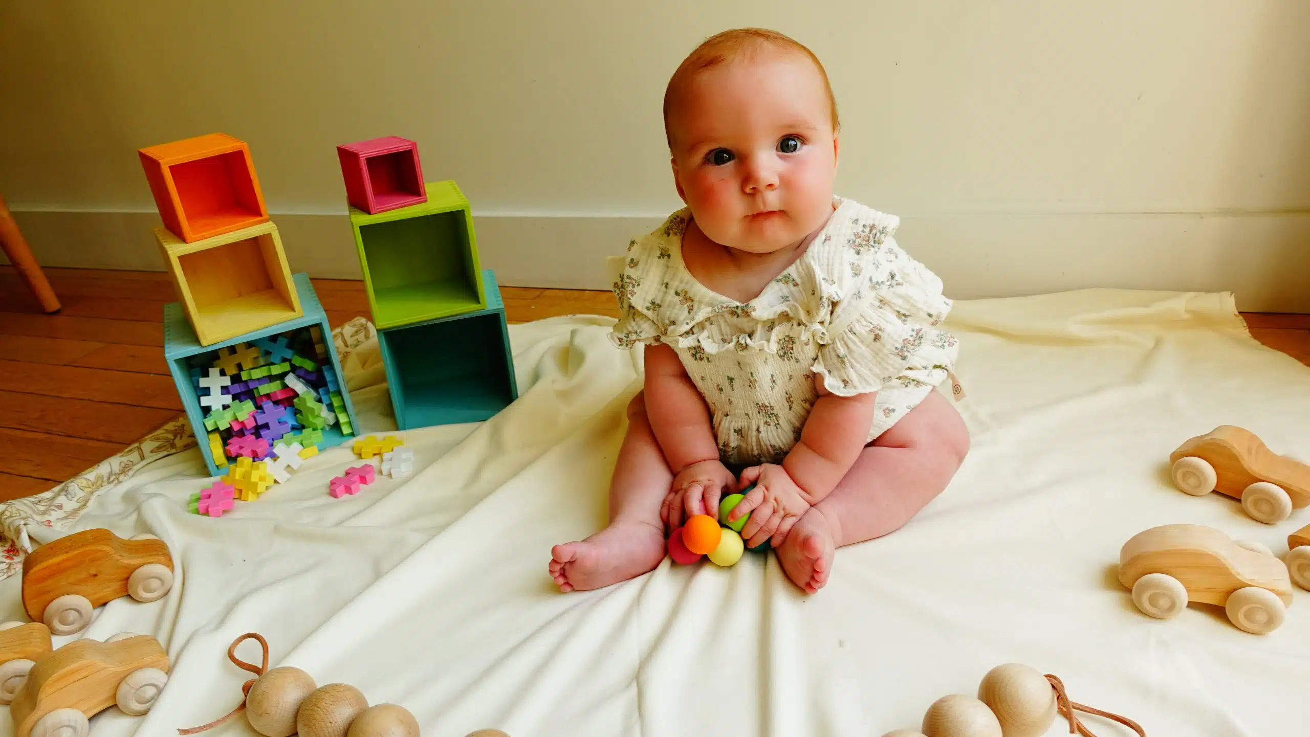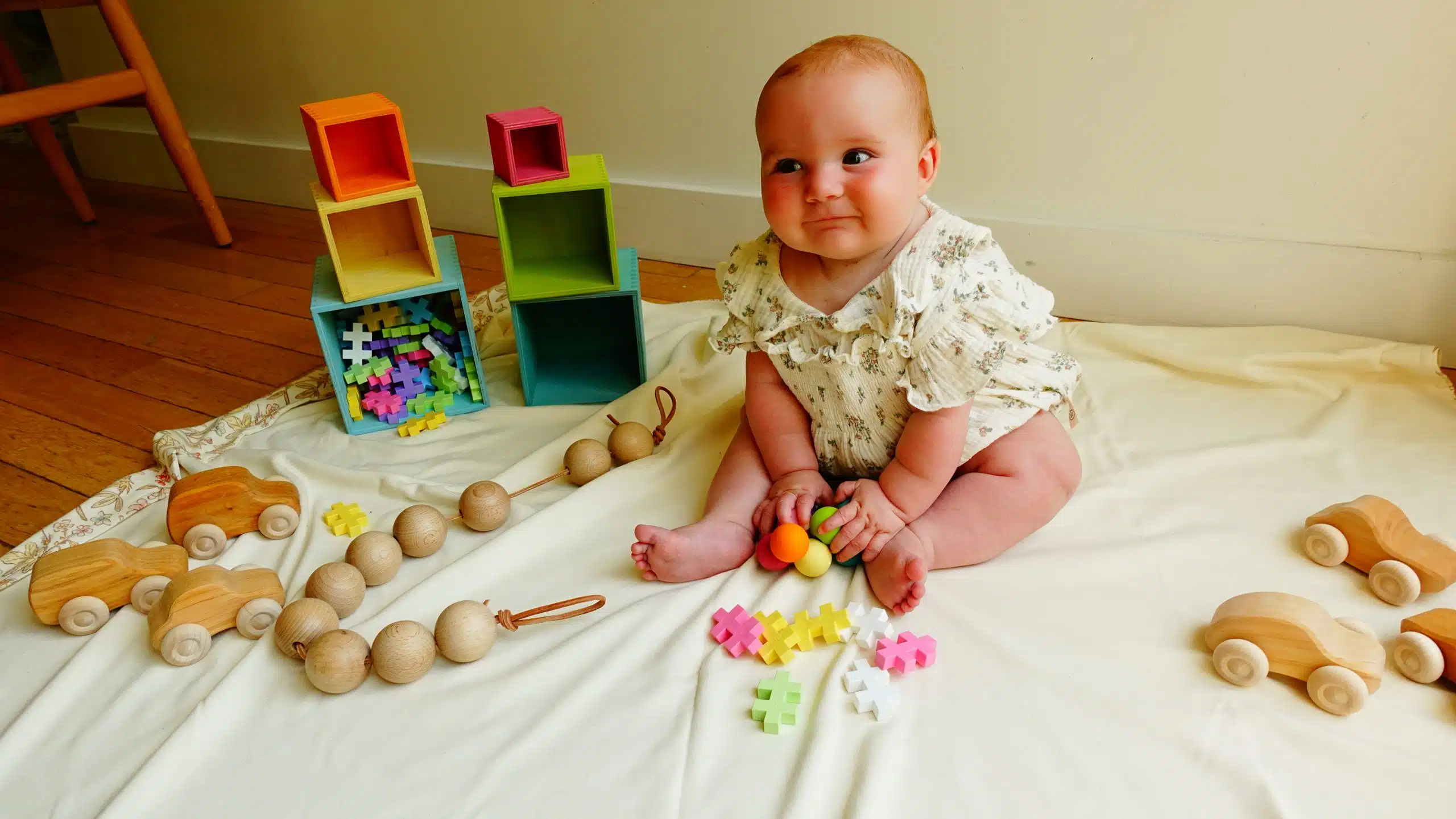 Au niveau sensoriel, le bébé pourra découvrir plusieurs textures différentes: le bois dur et lisse des blocs, les formes arrondies du bracelet sensoriel, des perles en bois naturel géantes et des voitures, la dureté et les angles des blocs Plus Plus, etc. Les boîtes empilables pourront servir à accueillir tous les petits trésors que les enfants trouveront. Ils s’amuseront sans doute à jouer à mettre « dedans » et ensuite à tout vider sur le plancher, créant des sons qui leur donneront envie de recommencer! Les boîtes placées à l’envers permettront à l’adulte de cacher des choses en-dessous, afin de s’amuser avec la permanence de l’objet. Les blocs et les boîtes pourront être empilés pour jouer avec l’équilibre. Qui n’a pas pris plaisir, enfant, à faire tomber une pile de blocs au compte de 3? C’est un plaisir coupable de la petite enfance!