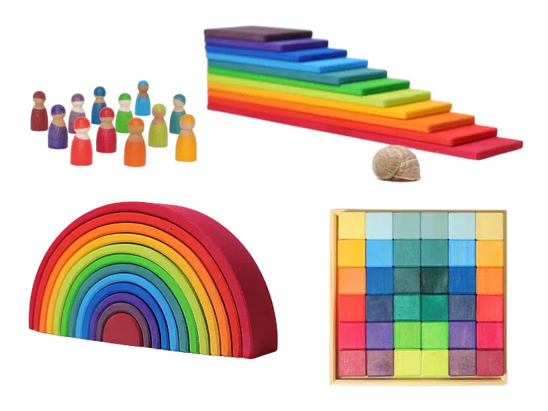 Ce coffret contient du matériel polyvalent aux couleurs de l’arc-en-ciel. On y retrouve donc uniquement des produits dont les couleurs s’agencent et s’associent parfaitement! Cet ensemble de matériel polyvalent invite donc les enfants à utiliser le jeu comme moteur de découvertes en faisant des essais et erreurs, en prenant des risques et en vivant de la satisfaction pendant qu’ils s’amusent. On pourra l’observer empiler, assembler, expérimenter l’équilibre, vivre les joies de la cause à effet et répéter les actions qui le stimulent. Il est un choix judicieux pour s’initier au matériel polyvalent, tout en pouvant servir d’ajout super intéressant à ce que vous possédez déjà et aux enfants qui maîtrisent bien le concept de polyvalence. Retrouvez nos deux marques chouchous dans le même coffret : Grimm’s et Grapat!