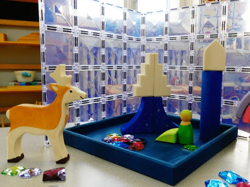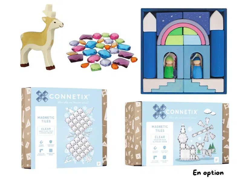 Le monde polaire en fascine plus d’un, par ses animaux et aussi par ses paysages époustouflants! Ce Coffret découverte a été créé en guise de complément au Coffret découverte – Monde polaire, afin d’ajouter du matériel pour bonifier les possibilités de jeu, d’augmenter les opportunités de constructions et de scénarios, tout en ajoutant un peu de couleur et de brillance! Avec les pierres scintillantes et les éléments du Monde à construire – Lumière polaire – Grimm’s, vous ajouterez quelques couleurs pastel pour inventer un tout autre univers, encore plus magique! Construisez un château de glace, un igloo pour les personnages, des inukshuks, des structures glacées, un monstre des neiges, des cachettes pour le chevreuil ou les animaux du Coffret découverte – Monde polaire, des glaciers et plus encore! Laissez votre imagination guider vos mouvements afin de créer en suivant votre élan! Ajoutez des lampions à piles pour offrir une toute autre dimension au jeu et aux explorations! Le matériel contenu dans ce Coffret apportera une touche hivernale en restant dans des couleurs douces et scintillantes, comme la neige!