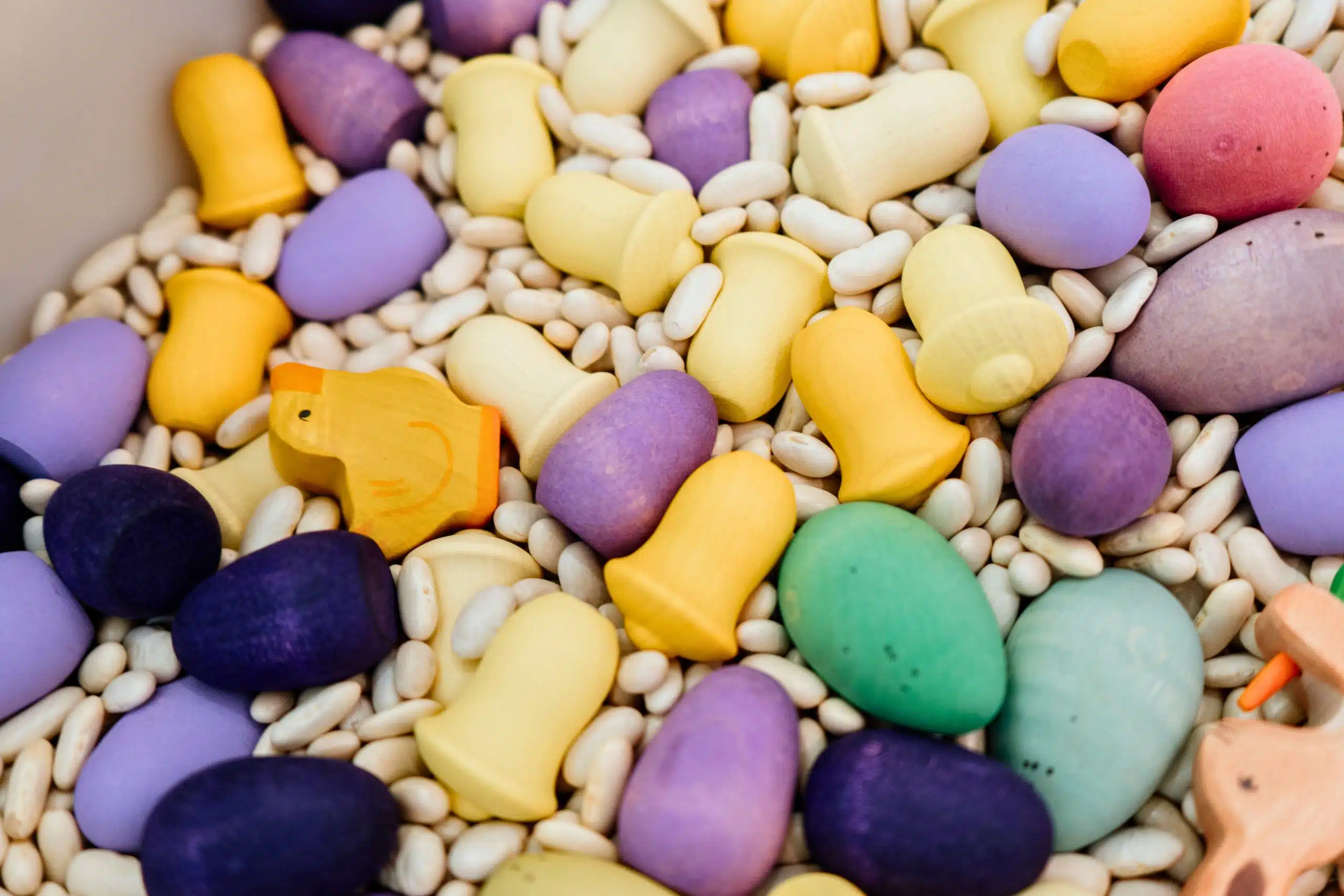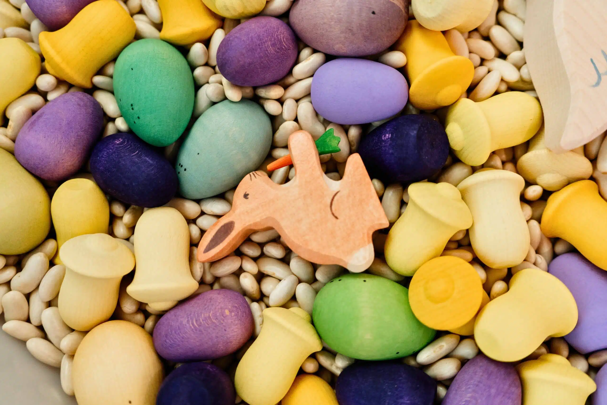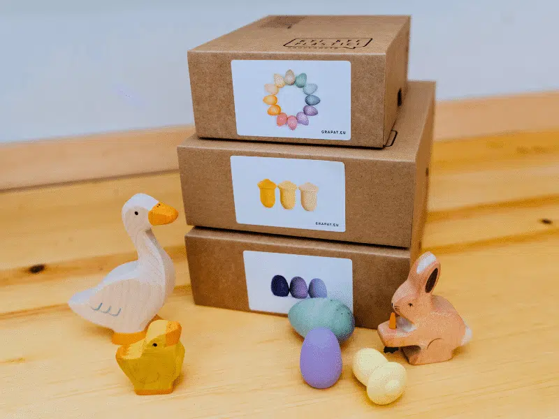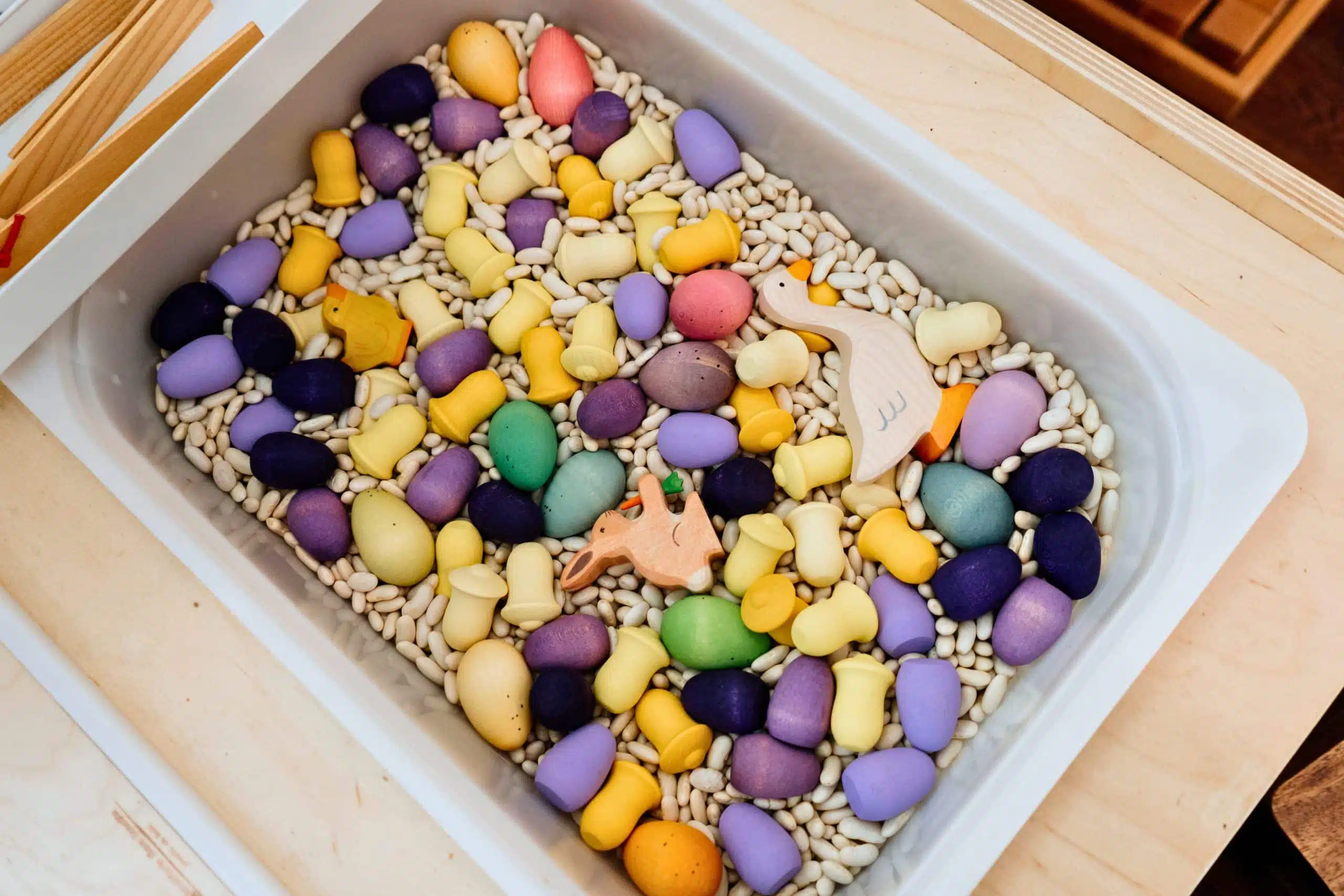 Pâques étant à nos portes, nous vous présentons le tout nouveau coffret découverte, parfait pour cette fête annuelle! Ce coffret peut à la fois être utilisé dans des constructions, pour manipuler librement, pour valoriser le tri, les comparaisons et le dénombrement, mais son contenu est génial lorsqu’il est intégré dans un bac sensoriel! Imaginez ces jolies pièces en bois coloré prendre place dans un lit de haricots noirs, de haricots blancs, de riz ou encore de pompons! Sa grande quantité d’oeufs fait de ce coffret un partenaire idéal pour vos chasses aux cocos, pour des heures de plaisir!
