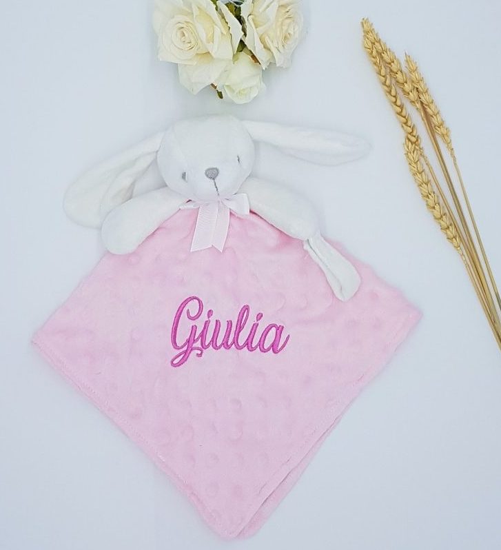 Coffret doudou lapinou personnalisé. Composition du coffret: Un doudou plat en matière minky à bulle brodé , une attache tétine en silicone sans BPA .Lavage à 30 degrés. Sèche-linge déconseillé.