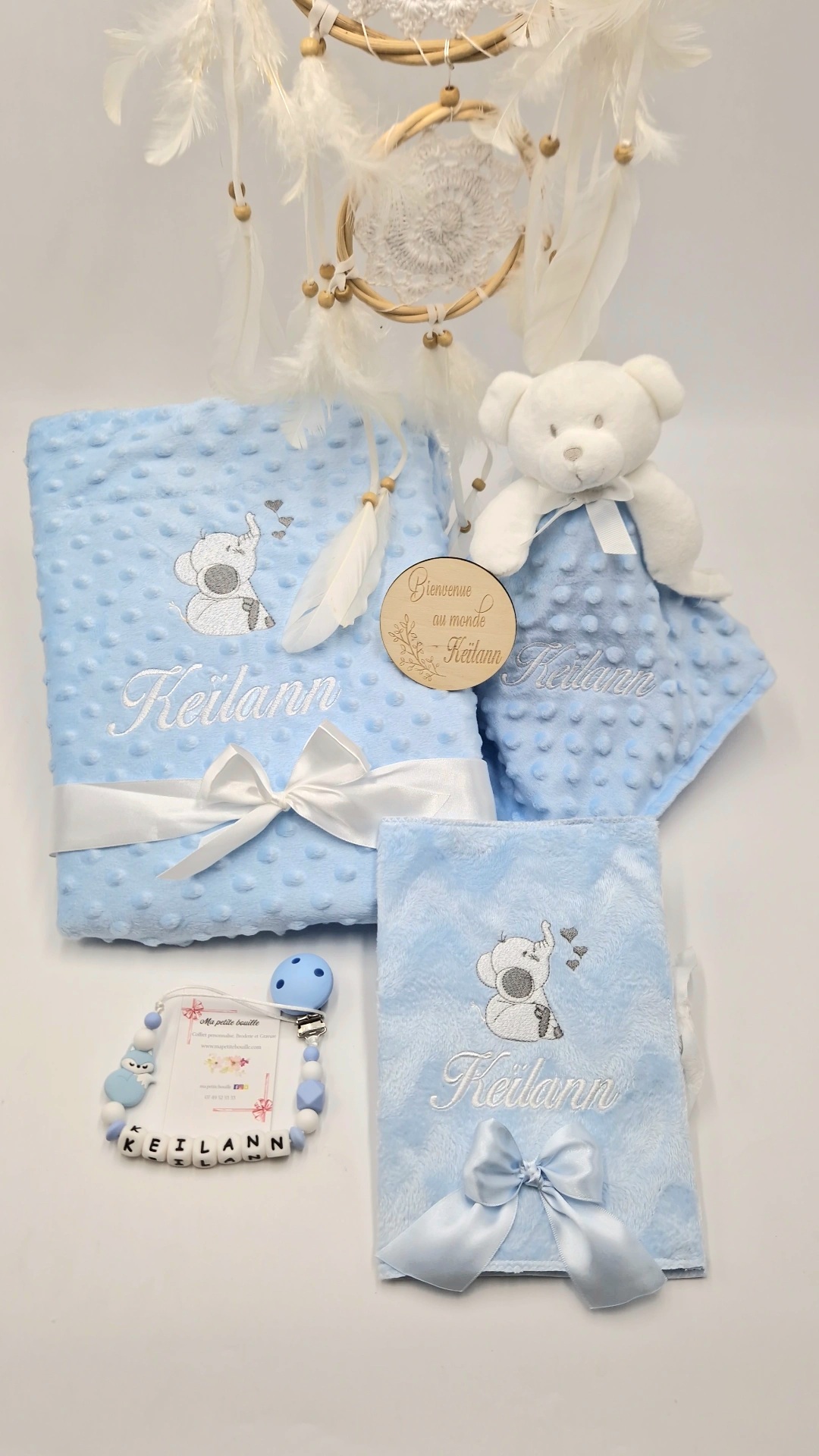 Composition du coffret: Un doudou plat en matière minky à bulle brodé , une attache tétine en silicone sans BPA .Lavage à 30 degrés. Sèche-linge déconseillé.