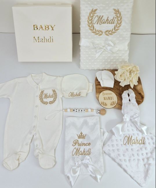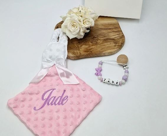 Coffret doudou personnalisé. Composition du coffret: Un doudou plat en matière minky à bulle brodé , une attache tétine en silicone sans BPA .Lavage à 30 degrés. Sèche-linge déconseillé.