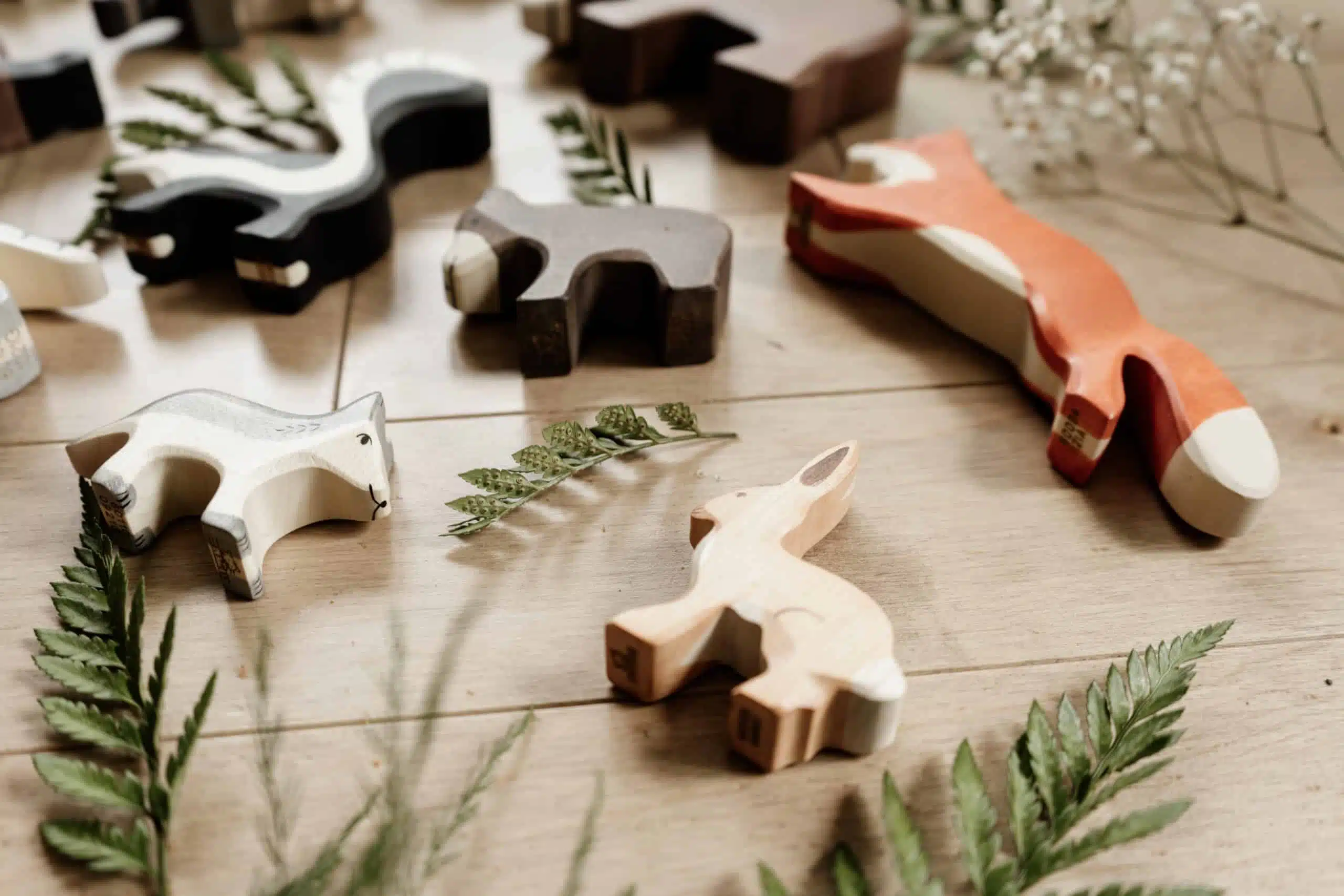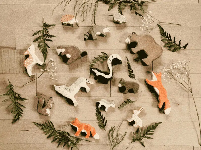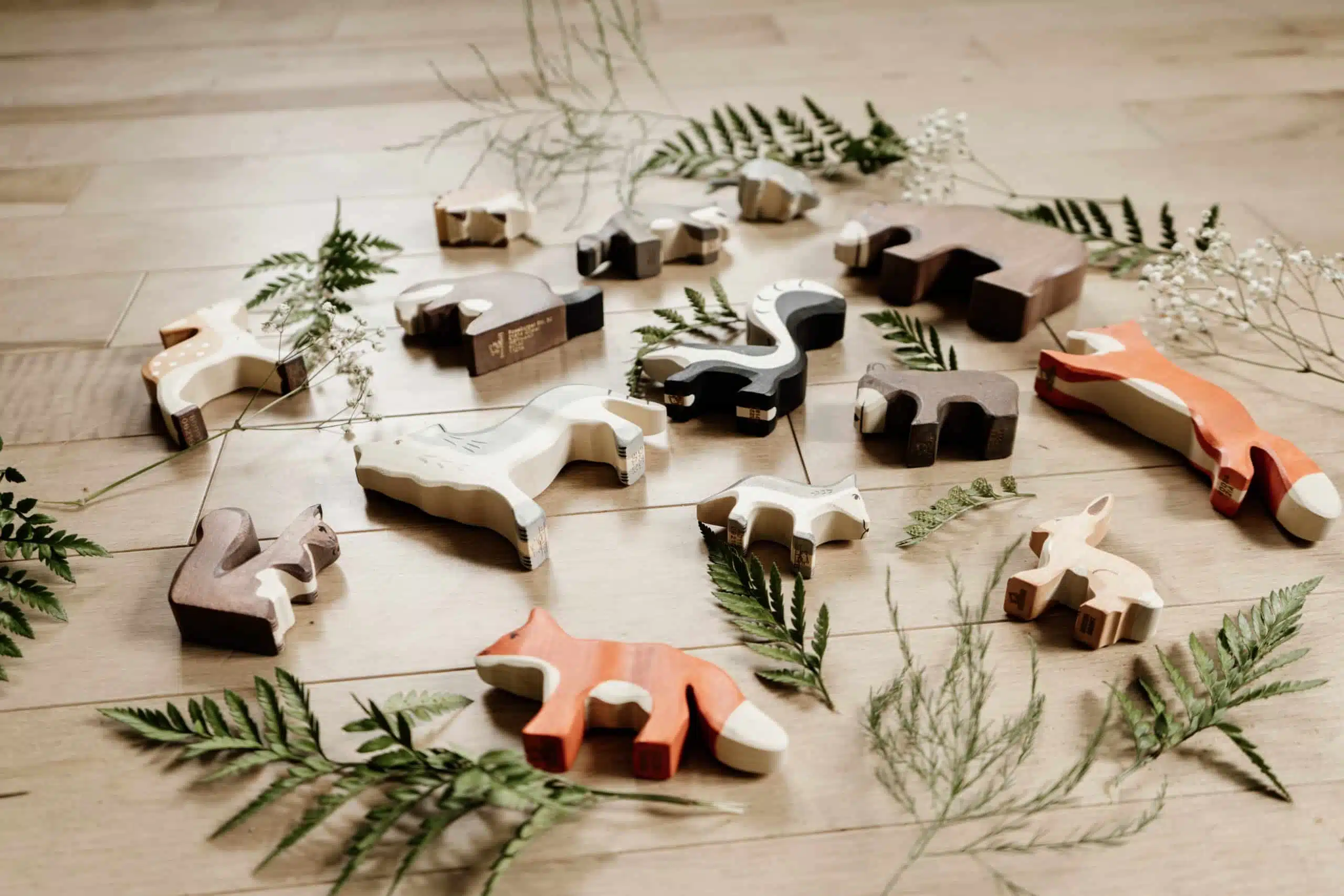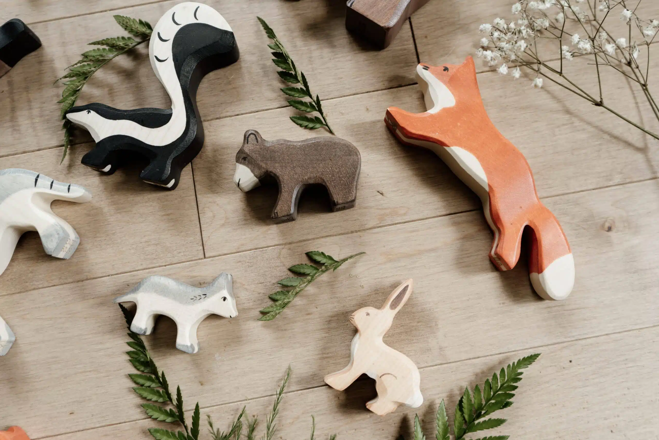 Ce coffret de figurines en bois Holztiger contient 14 animaux de la forêt : castor, mouffette, raton laveur, ours brun et son ourson, loup et son louveteau, renard et son renardeau, hérisson, faon, lièvre, souris et écureuil!