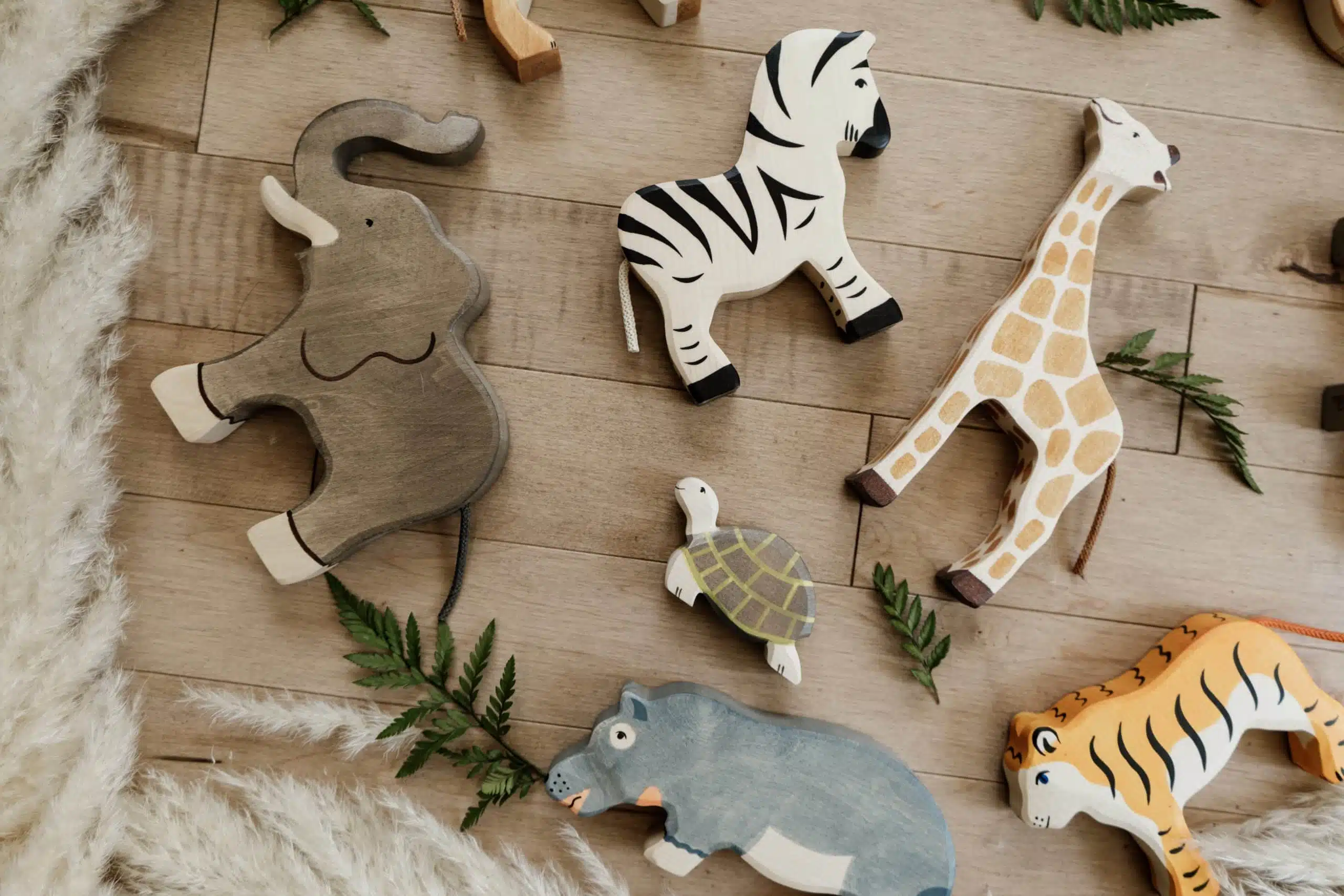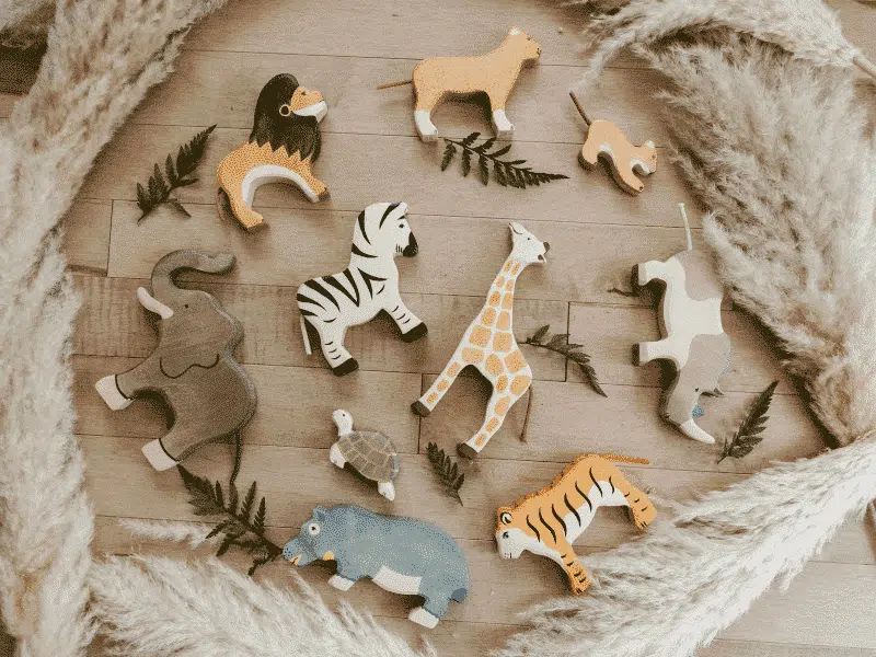 Ce coffret de figurines en bois Holztiger contient 10 animaux de la savane : lionne, lionceau, lion, tigre, rhinocéros, hippopotame, zèbre, girafe. éléphant et tortue!