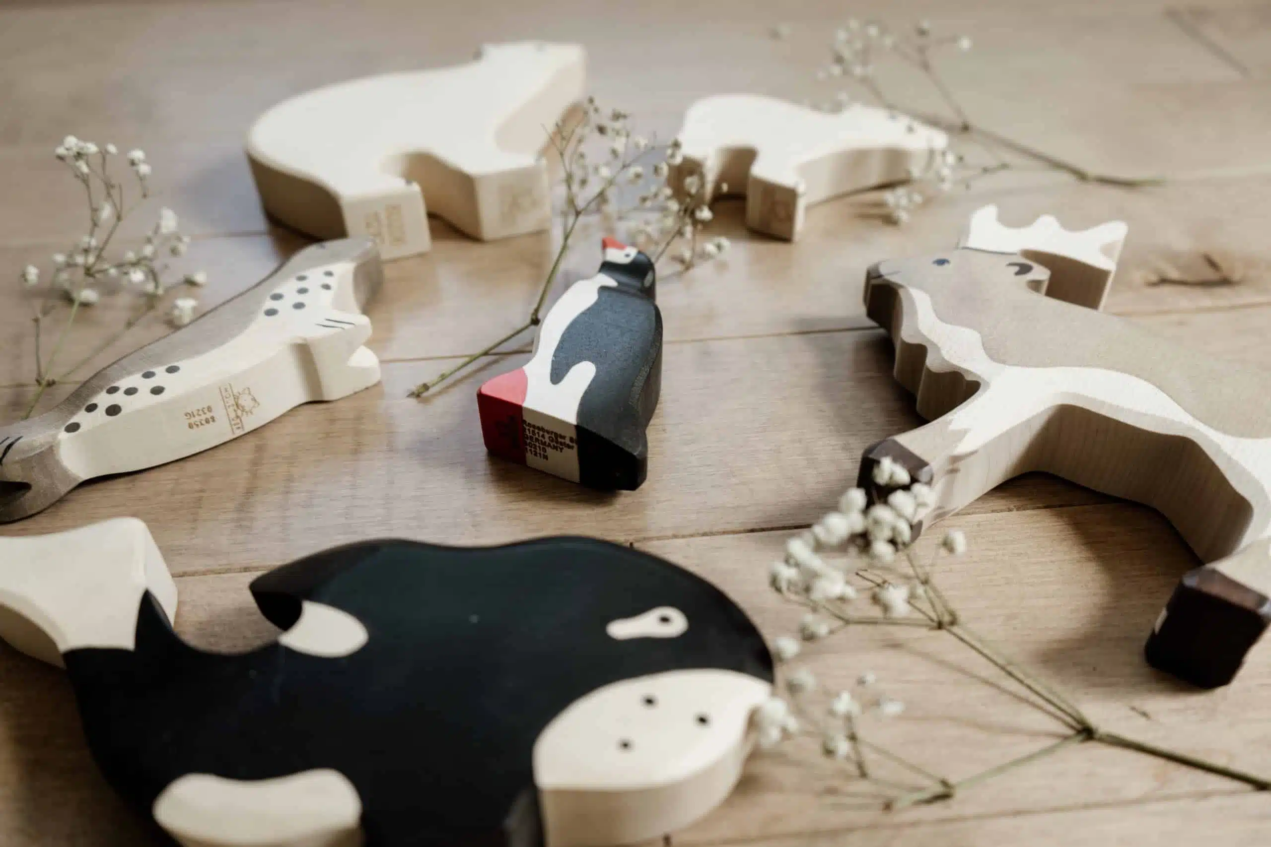 Ce coffret de figurines en bois Holztiger contient 6 animaux polaires : ourson polaire, ours polaire, phoque, pingouin, orque et renne!