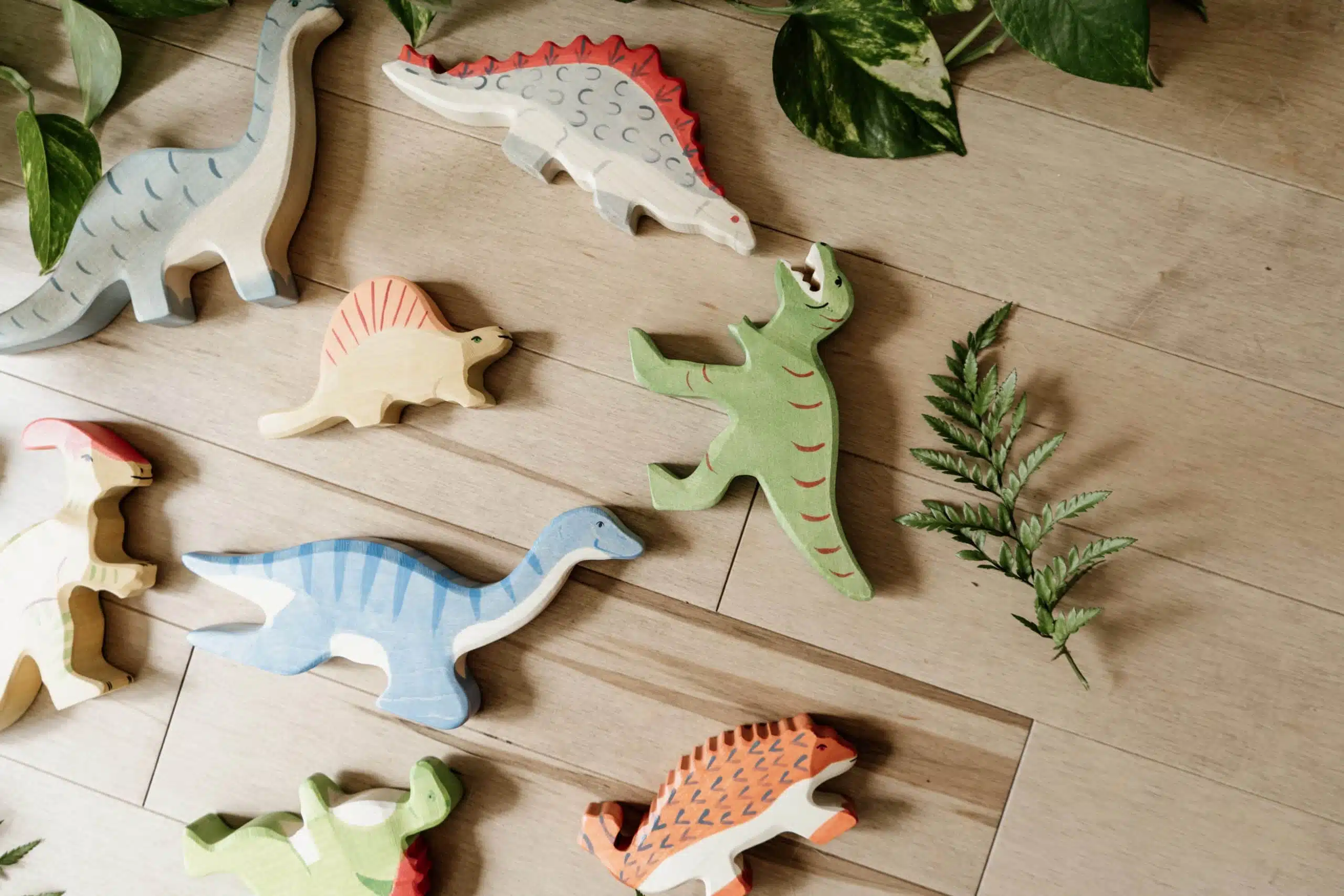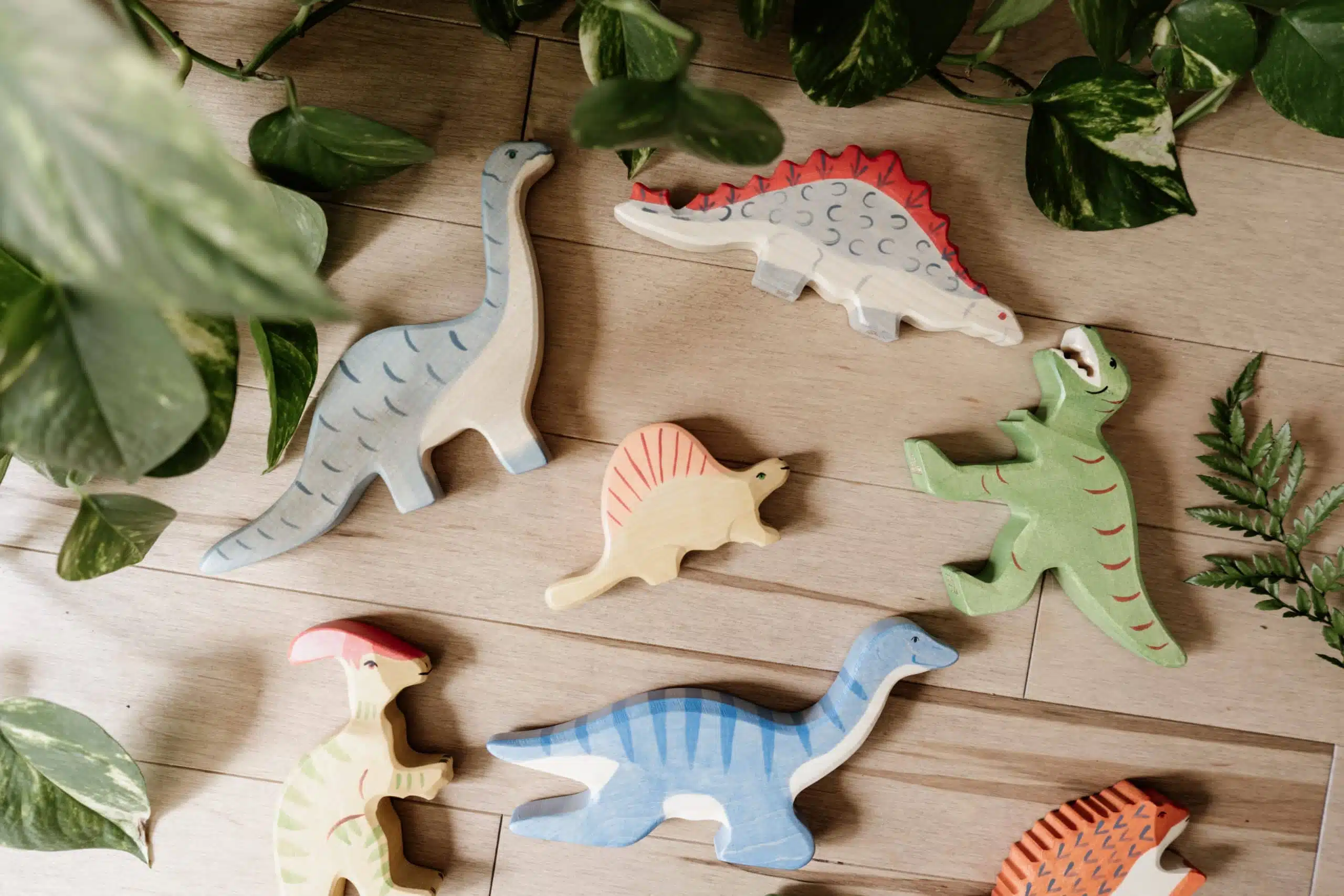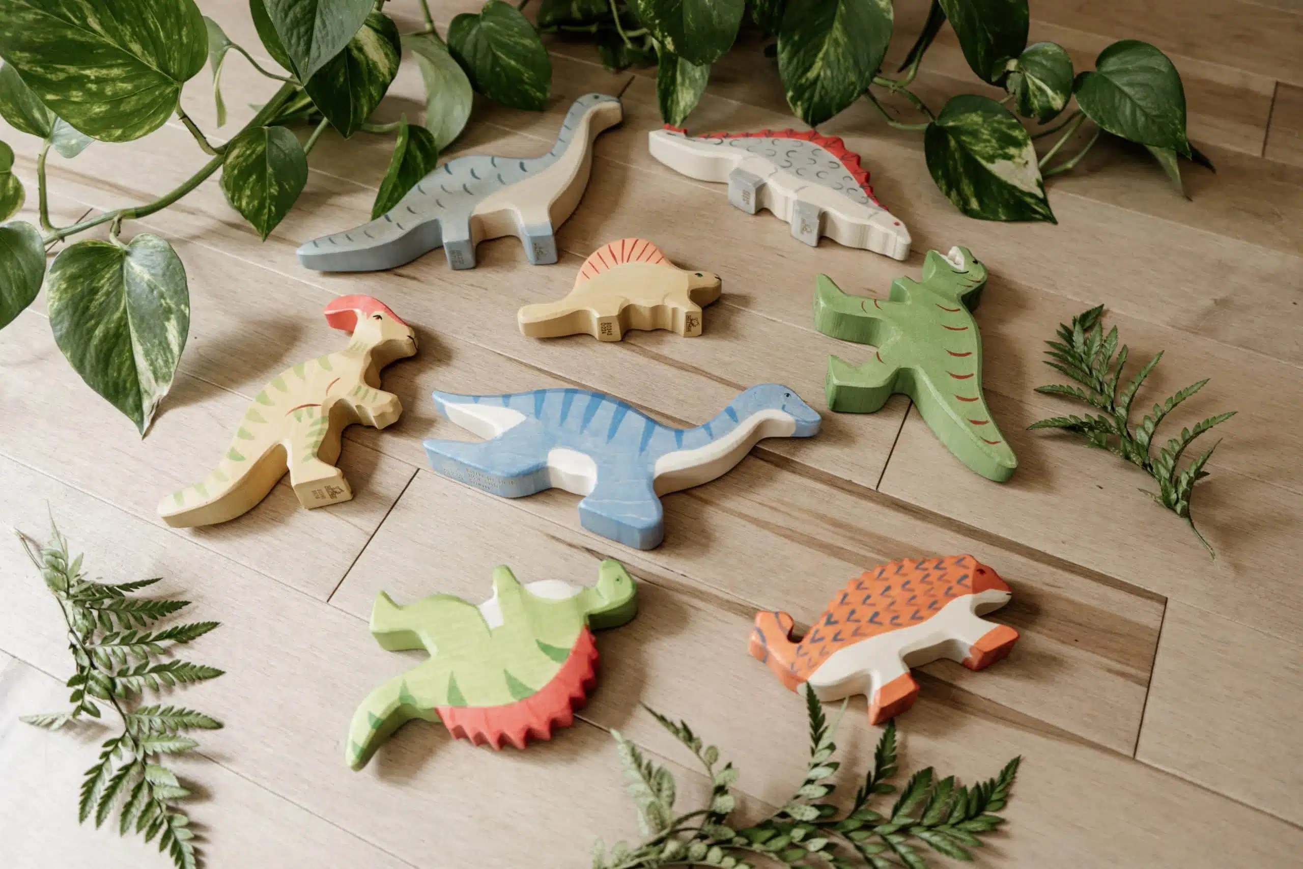 Ce coffret de figurines en bois Holztiger contient 8 dinosaures: parasaurolophus, spinosaurus, tyrannosaure, stegosaure, dimétrodon, ankylosaure, plésiosaure et brontosaure!