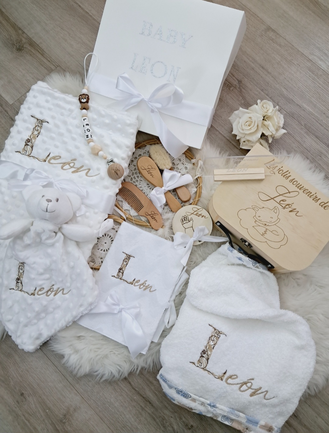 Coffret cadeau bébé. couverture matière minky à bulle taille 75×100, brodé doudou lapinou / ourson ou plat peignoir bébé personnalisé une attache tétine en silicone sans BPA brosse gravée peigne gravée boule de naissance gravée boîte de naissance gravée ou ensemble pyjama coton moufles, bonnet de naissance […]