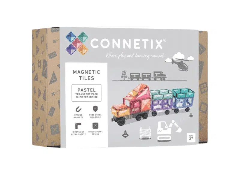 Préparez-vous à amener vos constructions Connetix à un tout autre niveau avec cet ensemble de Transport Pastel comprenant 50 morceaux! Conçu pour les passionnés des véhicules, cet ensemble contient une base grise réversible, 2 bases claires avec de vraies roues en caoutchouc ainsi qu’une gamme de formes et de tuiles magnétiques pour aider à construire et à créer des conceptions de véhicules à l’infini! Découvrez l’apprentissage STEAM en naviguant dans le magnétisme, les formes et les couleurs pour créer vos propres camions, trains, avions, ambulances, camions de pompiers et chariots élévateurs. Laissez place à votre imagination et donnez-lui vie avec l’ensemble de transport arc-en-ciel Connetix.