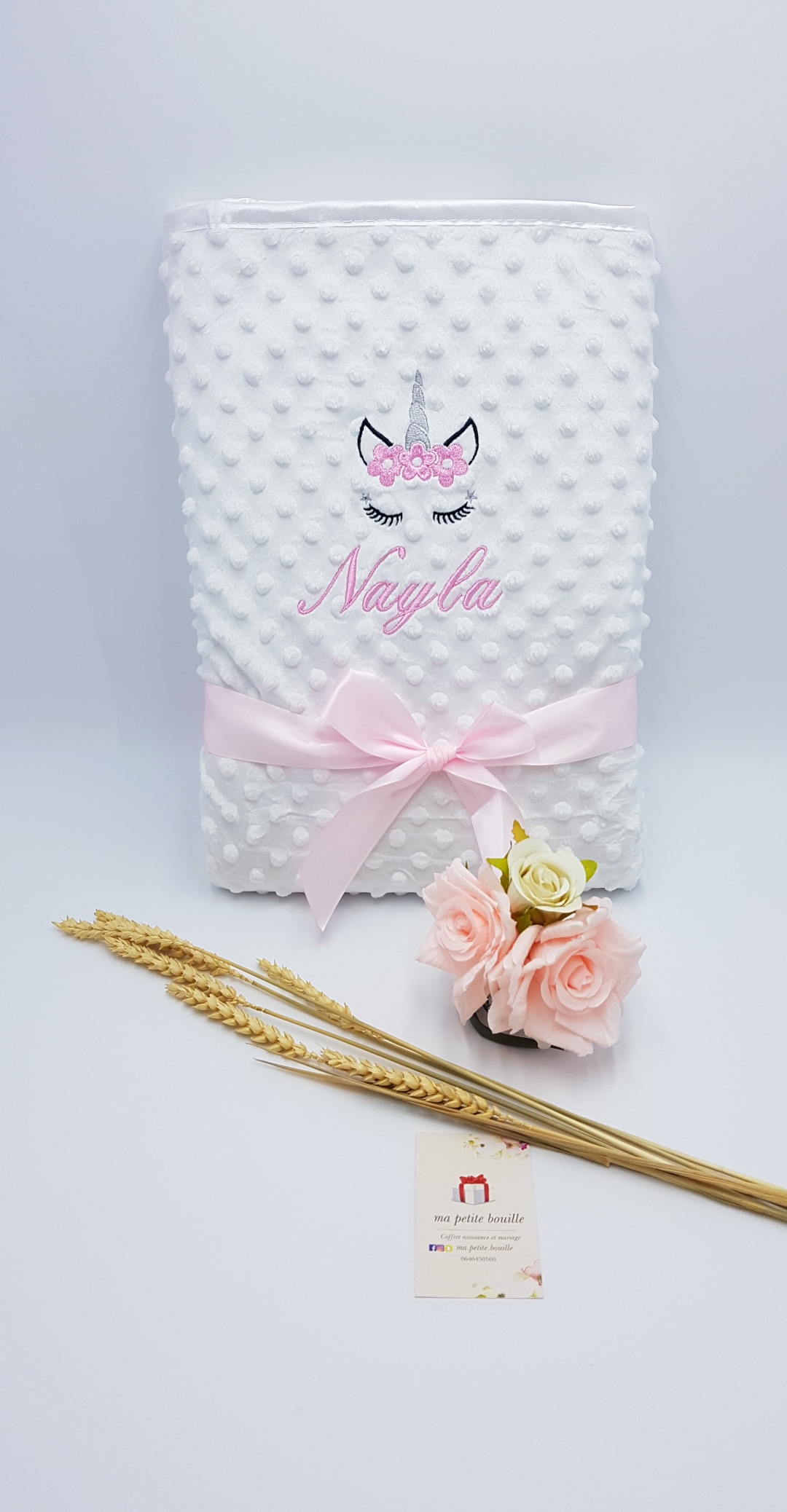 Couverture personnalisée blanche. Environ 75×90 cm Lavage à 30 degrés. Sèche-linge déconseillé.