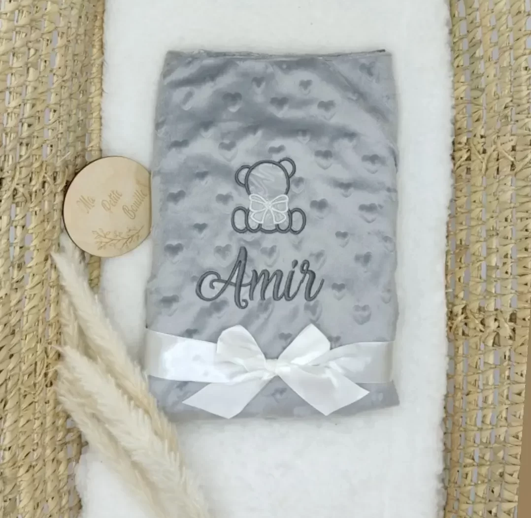 Couverture personnalisée grise. La couverture Minky est idéal pour votre bébé. Elle peut être utilisé pour couvrir la poussette, landau ou décorer le lit de bébé. Dimension de la couverture: 75×100. La broderie d’un prénom est inclus. Lavage à 30 degrés. Sèche-linge déconseillé.