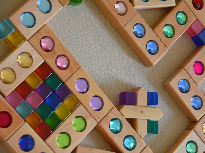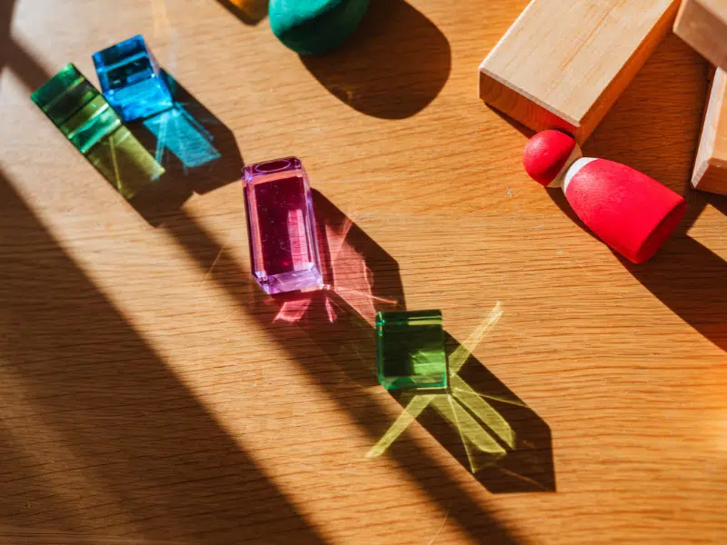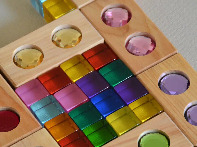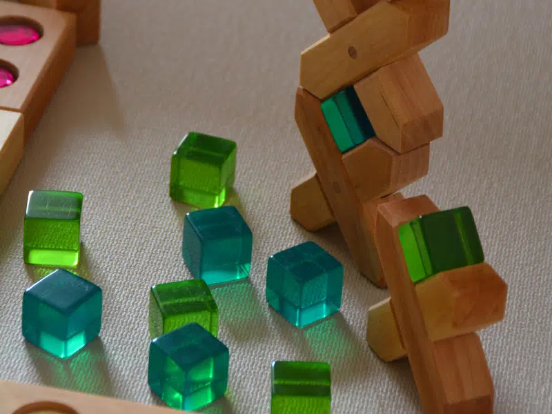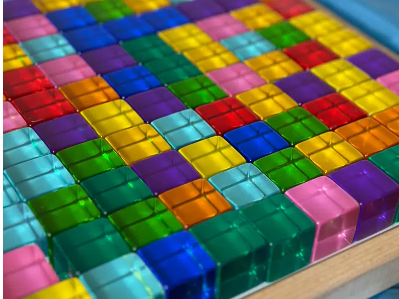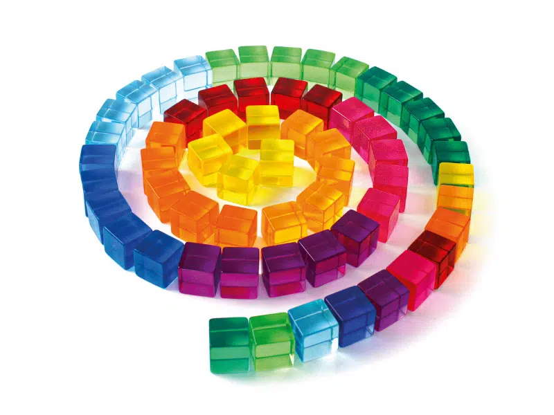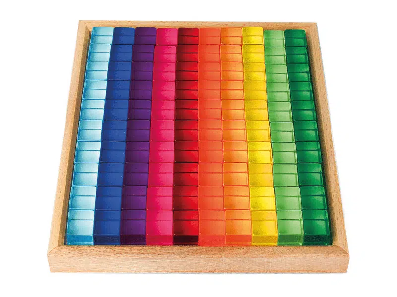 Ce magnifique ensemble de cubes transparents de Bauspiel contient 100 morceaux (10 couleurs, 10 blocs par couleur). À utiliser dans des bacs sensoriels, dans des univers féériques ou pour rehausser les constructions et faire des jeux de lumière (table lumineuse, lampe de poche, etc.).
