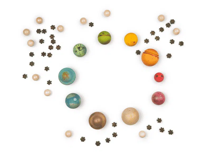 Grapat ne cesse de nous surprendre! Avec le Dear Universe, qui contient plus 40 morceaux, permet de recréer le système solaire… presqu’en entier! Explorez l’espace avec ces jolies planètes! En plus d’être des objets créés afin de permettre les jeux illimités, les planètes constituent également un complément parfait au Calendrier hebdomadaire coloré en bois – 7 lunes (GRA17168). Comme les jours de la semaine portent à l’origine le nom de planètes, vous pourrez tous les faire correspondre. Comme nous, tombez sous le charme de cet univers colorés qui offre une foule de possibilités d’exploration, de manipulations et de découvertes! Créez plus qu’un univers spatial! Utilisez les pièces pour décorer l’espace de jeu, agrémenter les constructions, utiliser les sphères comme des balles/billes, etc. Ce matériel polyvalent est une façon magnifique d’aborder l’espace avec les enfants et ainsi les initier aux merveilles de notre univers! 3 ans et +