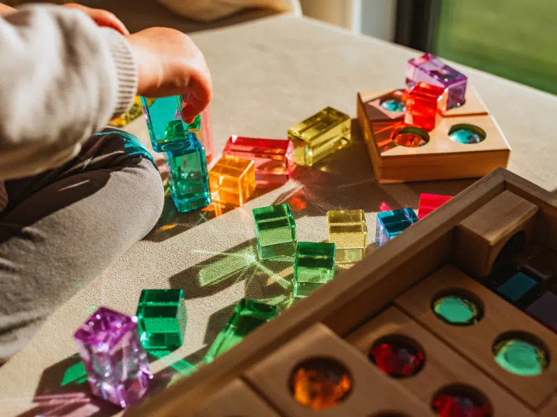 Tombez sous le charme de ce somptueux ensemble de diamants et des cubes transparents de 45 morceaux de Bauspiel. à utiliser dans des bacs sensoriels, dans des univers féériques ou pour rehausser les constructions.