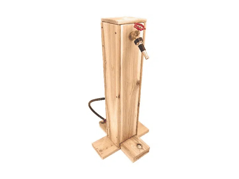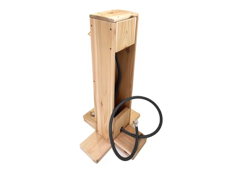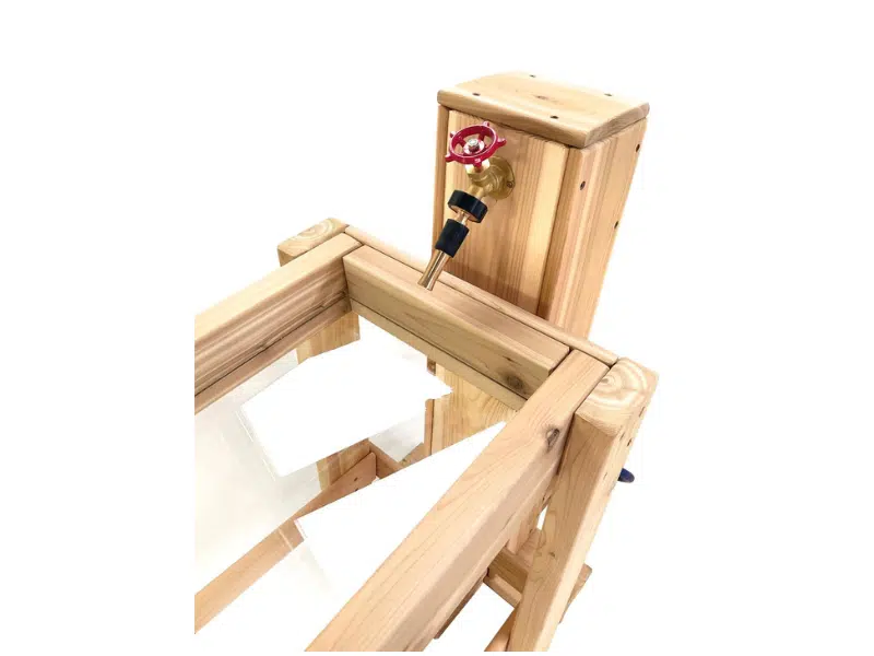 Il dispose de deux points de réglage du débit : un pour les petites mains à la sortie du robinet et un pour les adultes. Un tuyau standard court est inclus dans le support en cèdre pour un raccordement facile à votre robinet extérieur. Ce tuyau court facilite le débranchement lorsque les températures négatives nécessitent la fermeture des robinets extérieurs.