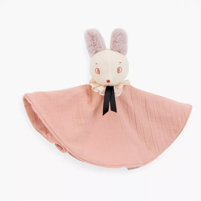 Doudou Brume avec sa robe en lange rose poudré, surmontée d’une collerette à fleurs. Son adorable minois brodé et ses grandes oreilles en fourrure se glisseront auprès de bébé pour ses moments de rêverie. Il peut être brodé au prénom de l’enfant.
