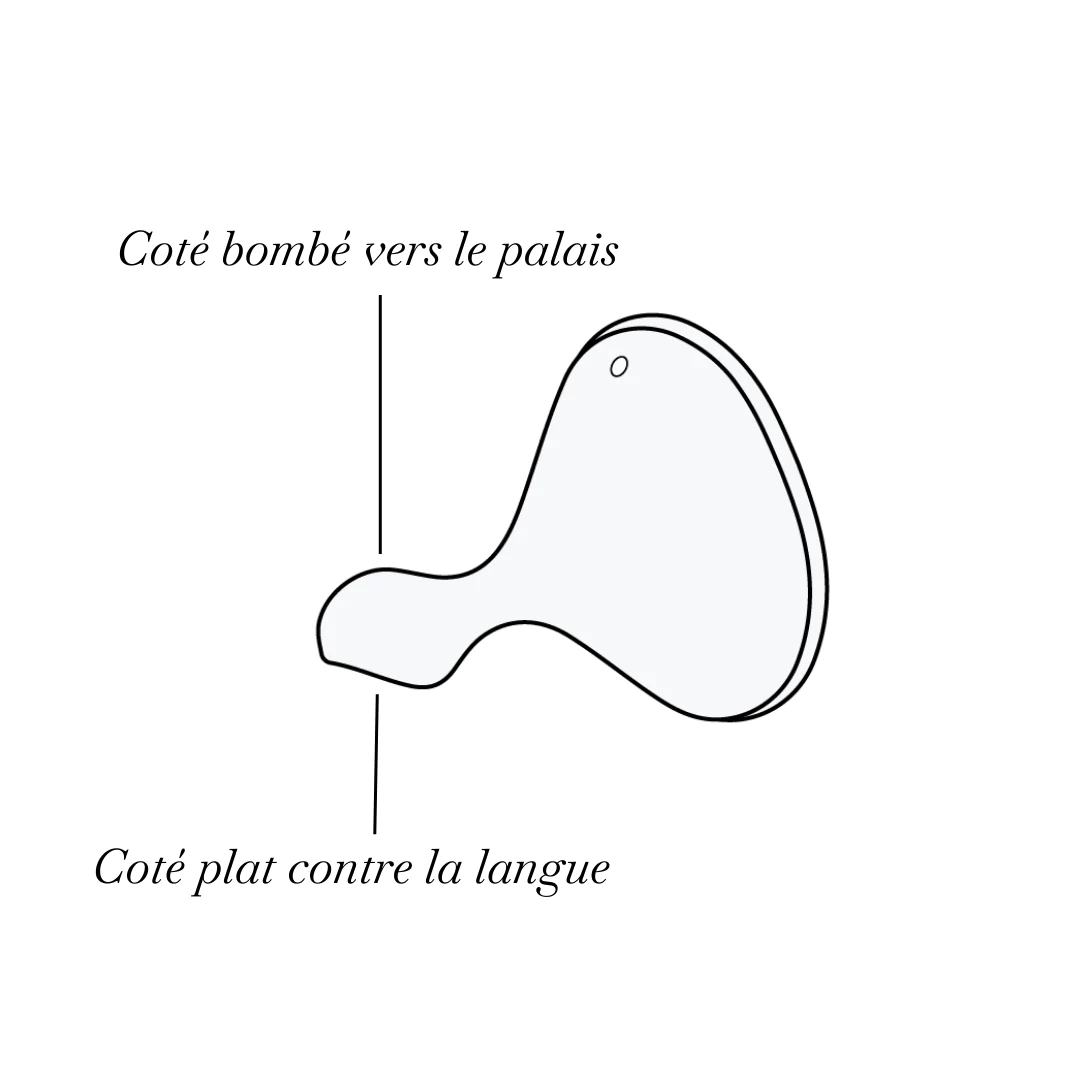 Le tétine Élhée est de forme physiologique, avec un côté plat contre la langue et un côté bombé, vers le palais. Conçue en silicone extrasouple pour s’adapter au mieux à la cavité buccale de l’enfant et contribuer à son bon développement (recommandée par l’Union Française pour la Santé Bucco-Dentaire).