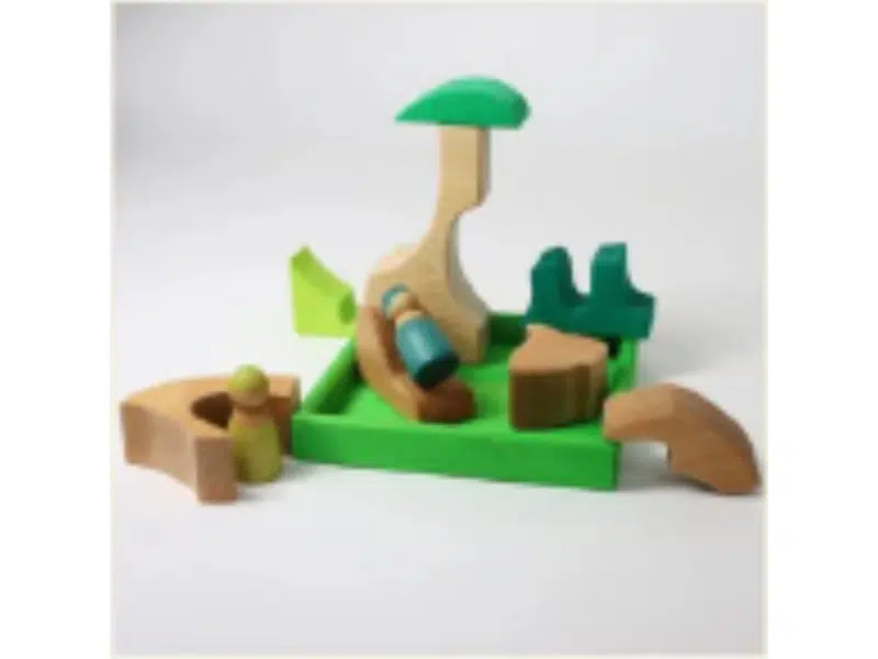 Cet ensemble de construction (écureuil) de Grimm’s peut être utilisé pour construire ou comme casse-tête. Dans son plateau en bois, cet ensemble forme un écureuil niché en sécurité parmi les feuilles. À l’extérieur du plateau, les grands blocs géométriques se transforment en mondes imaginaires de jungle et en paysages de dinosaures.