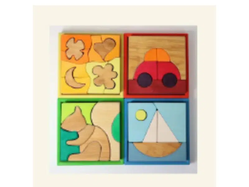 Cet ensemble de construction (écureuil) de Grimm’s peut être utilisé pour construire ou comme casse-tête. Dans son plateau en bois, cet ensemble forme un écureuil niché en sécurité parmi les feuilles. À l’extérieur du plateau, les grands blocs géométriques se transforment en mondes imaginaires de jungle et en paysages de dinosaures. Grands morceaux en bois […]