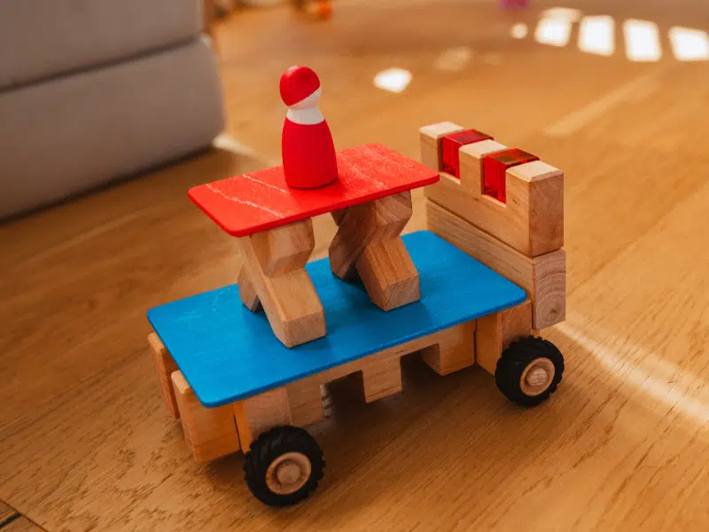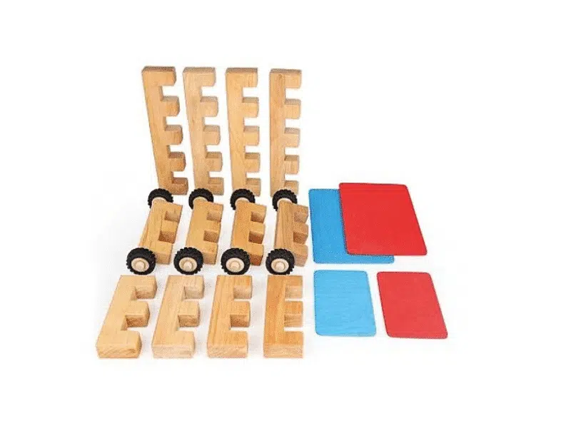 Cet ensemble de véhicules de Bauspiel comporte 16 morceaux de gros formats. Les tuiles colorées sont conçues pour fonctionner avec les essieux et les blocs en bois servant d’axes. C’est l’ensemble parfait pour créer des véhicules selon votre imagination.