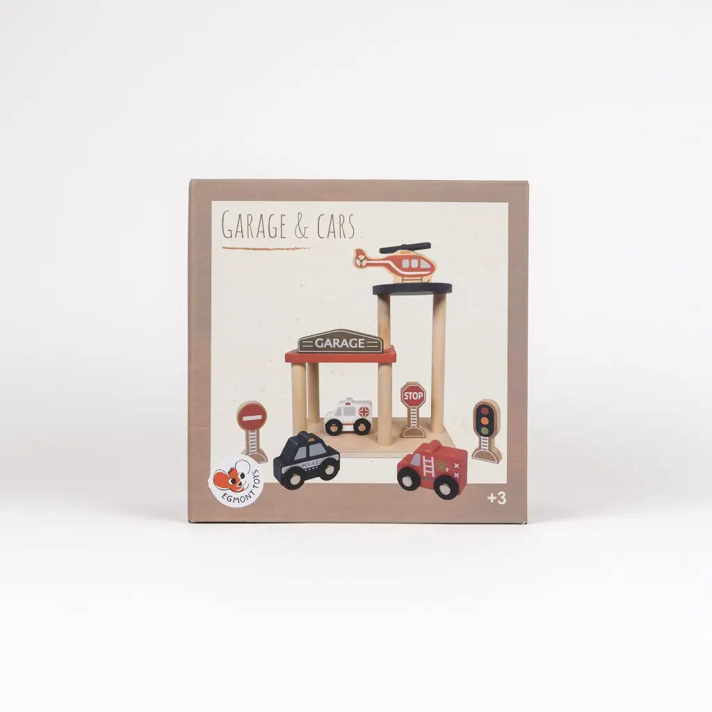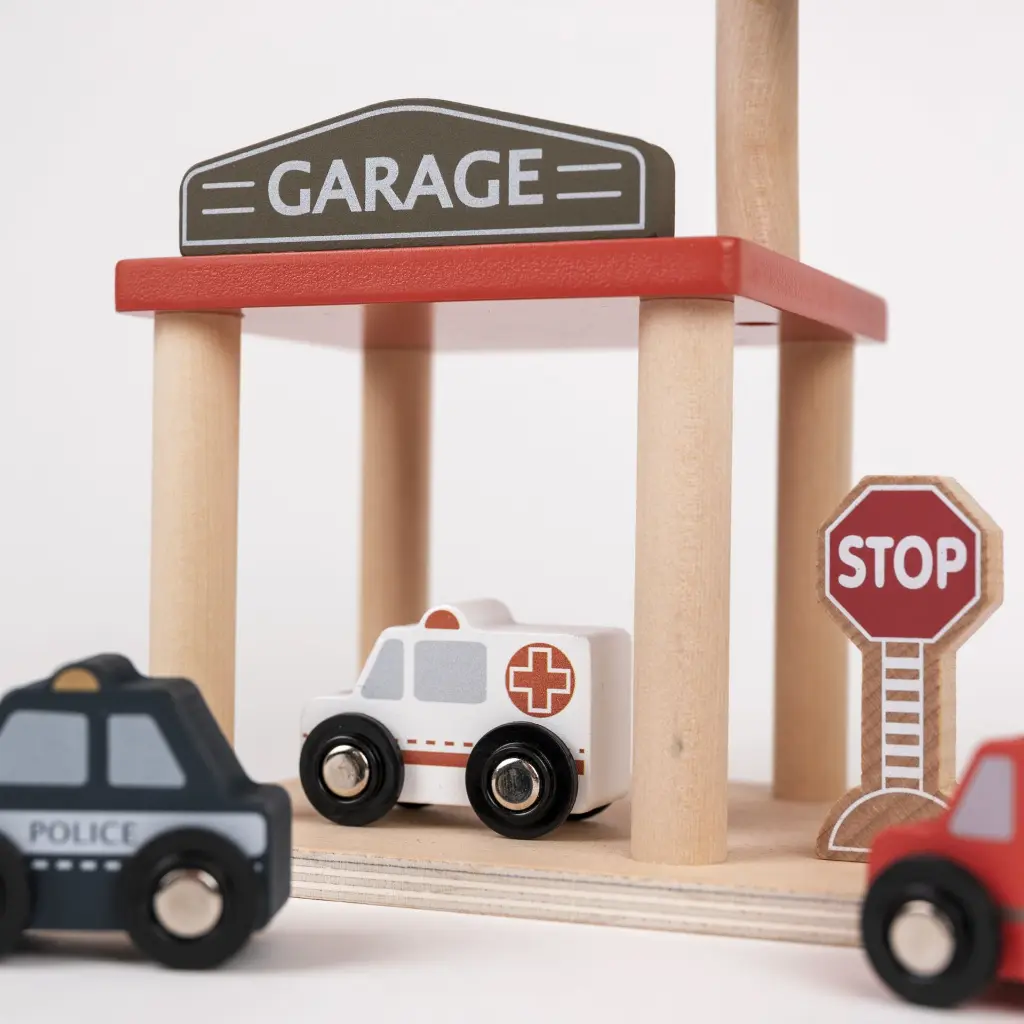 Une voiture de police, une ambulance, un camion de pompiers et un hélicoptère tournent autour du joli garage en bois. Respectez les panneaux de signalisation ! Tout est inclus dans la boîte