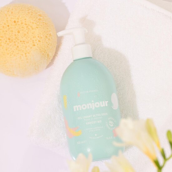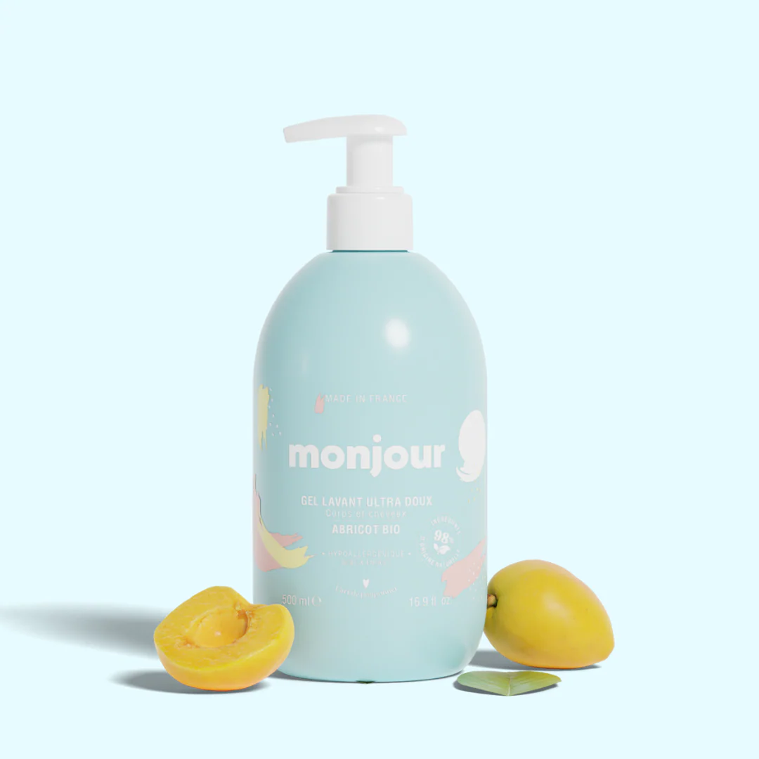 Le Gel Lavant Monjour à l’odeur irrésistible s’utilise dès la naissance à la fois pour le corps et les cheveux de bébé.