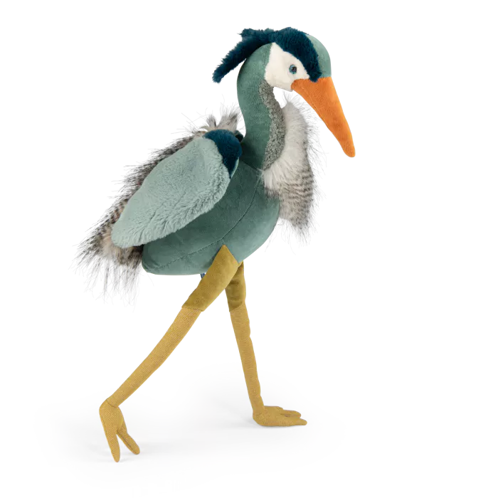 Oh quel joli héron ! Le voilà qui se pose tout près des petits après un vol majestueux. A la fourrure toute douce et aux longues pattes pailletées, il sera le compagnon idéal pour voyager tout autour du monde.