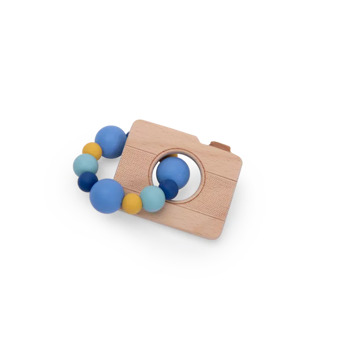 Hochet anneau de dentition bois et silicone appareil photo | Puce & Pilou