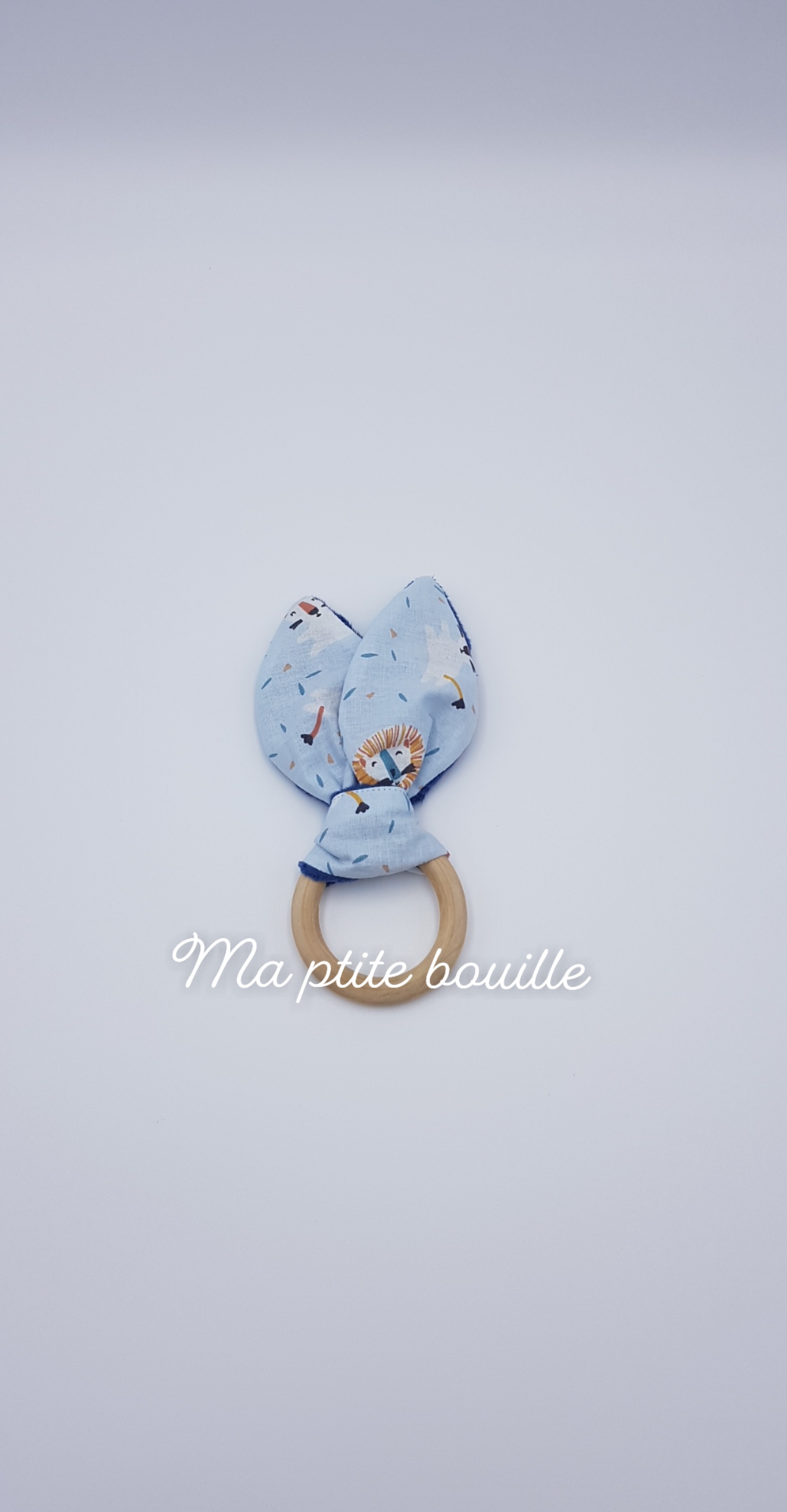 L’anneau de dentition est confectionné soigneusement à la main. Anneau de 7 cm de diamètre, et tissus minky.