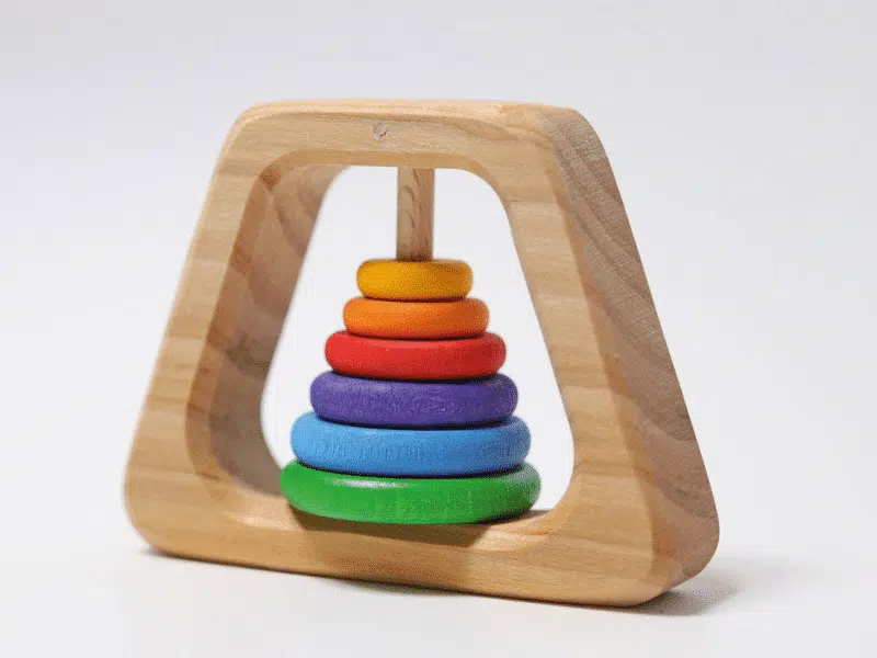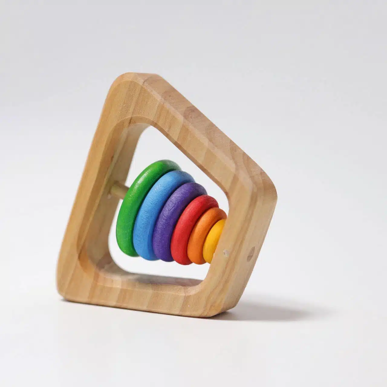 Le hochet (ou anneau de dentition) est composé de six disques en bois aux couleurs de l’arc-en-ciel. Le bois utilisé de l’aulne est très particulier et donne une structure unique à chacun des hochets Grimm’s. La finition à l’huile végétale protège le bois et accentue cette structure vive. Le bébé prendra plaisir à manipuler le hochet, à créer du bruit et à mâchouiller les anneaux qui se déplaceront en les touchant. Le bois offre une texture agréable à toucher et à explorer! En grandissant, l’enfant pourra s’en servir comme boulier miniature. Le hochet est si beau qu’il pourra même servir de décoration une fois que l’enfant aura grandit!