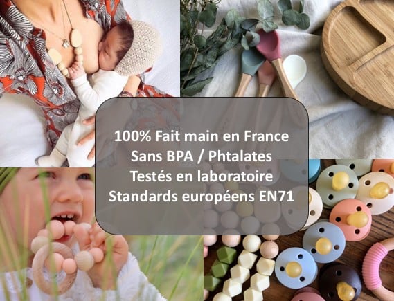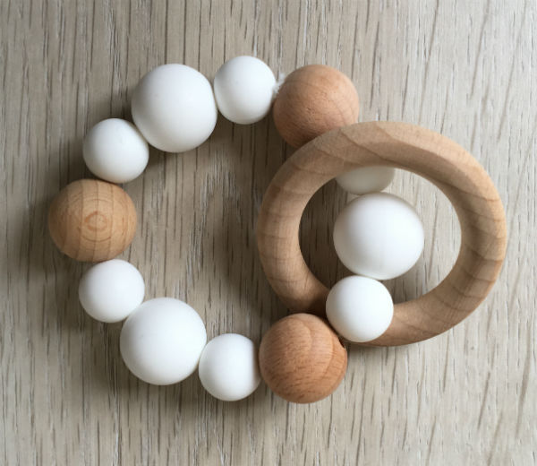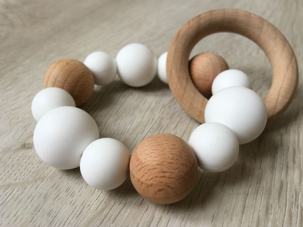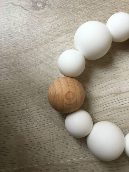 Perles en bois naturel et en silicone alimentaire sans BPA. Idéal pour appréhender les matières et soulager les poussées dentaires.